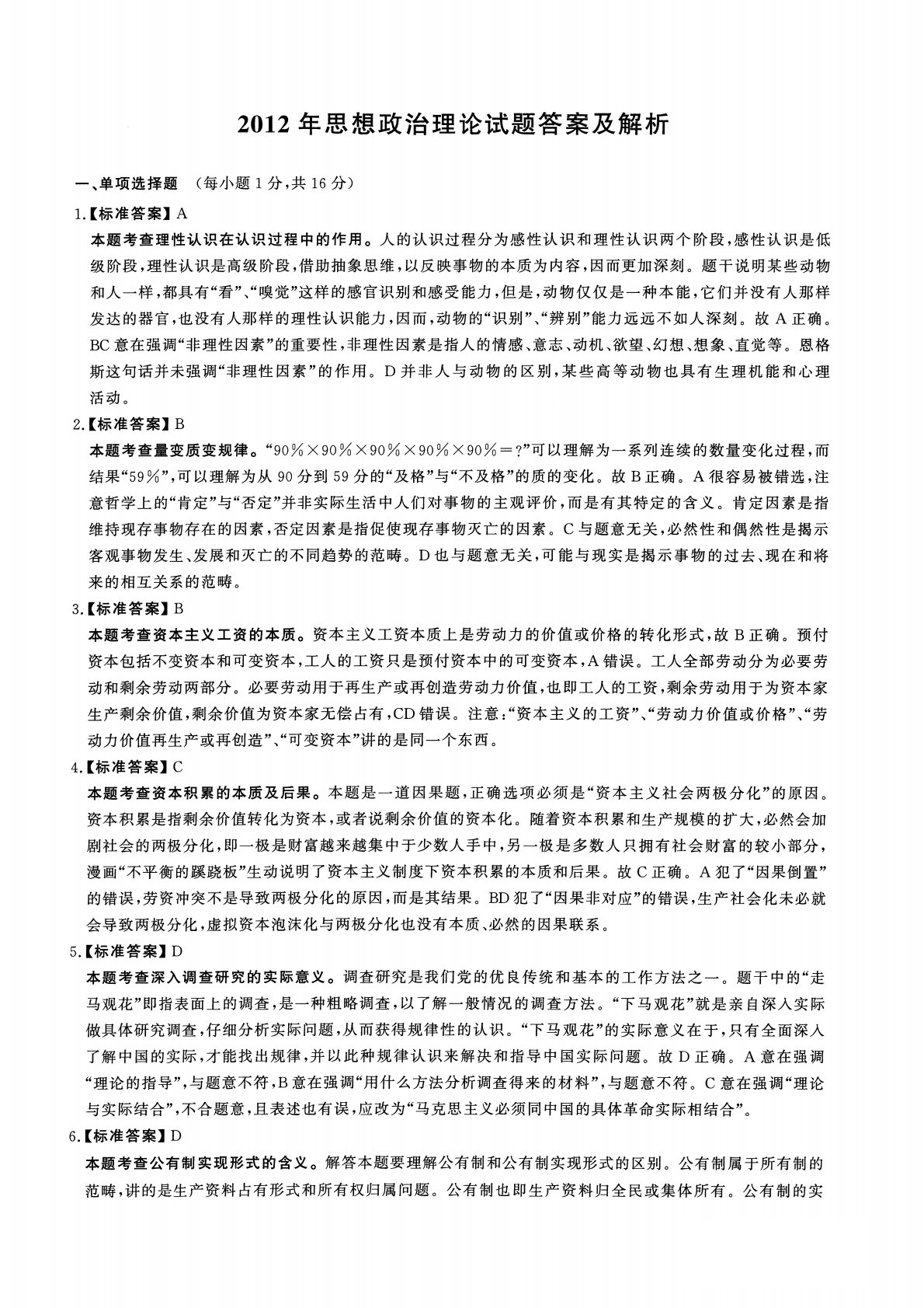 2012年思想政治理论试题答案及解析一、单项选择题(每小题1分,共16分)1.【标准答案】A本题考查理性认识在认识过程中的作用。人的认识过程分为感性认识和理性认识两个阶段,感性认识是低级阶段,理性认识是高级阶段,借助抽象思维,以反映事物的本质为内容,因而更加深刻。题千说明某些动物和人一样,都具有“看”、“嗅觉”这样的感官识别和感受能力,但是,动物仅仅是一种本能,它们并没有人那样发达的器官,也没有人那样的理性认识能力,因而,动物的“识别”、“辨别“能力远远不如人深刻。故A正确。BC意在强调“非理性因素”的重要性,非理性因素是指人的情感、意志、动机、欲望、幻想、想象、直觉等。恩格斯这句话并未强调“...