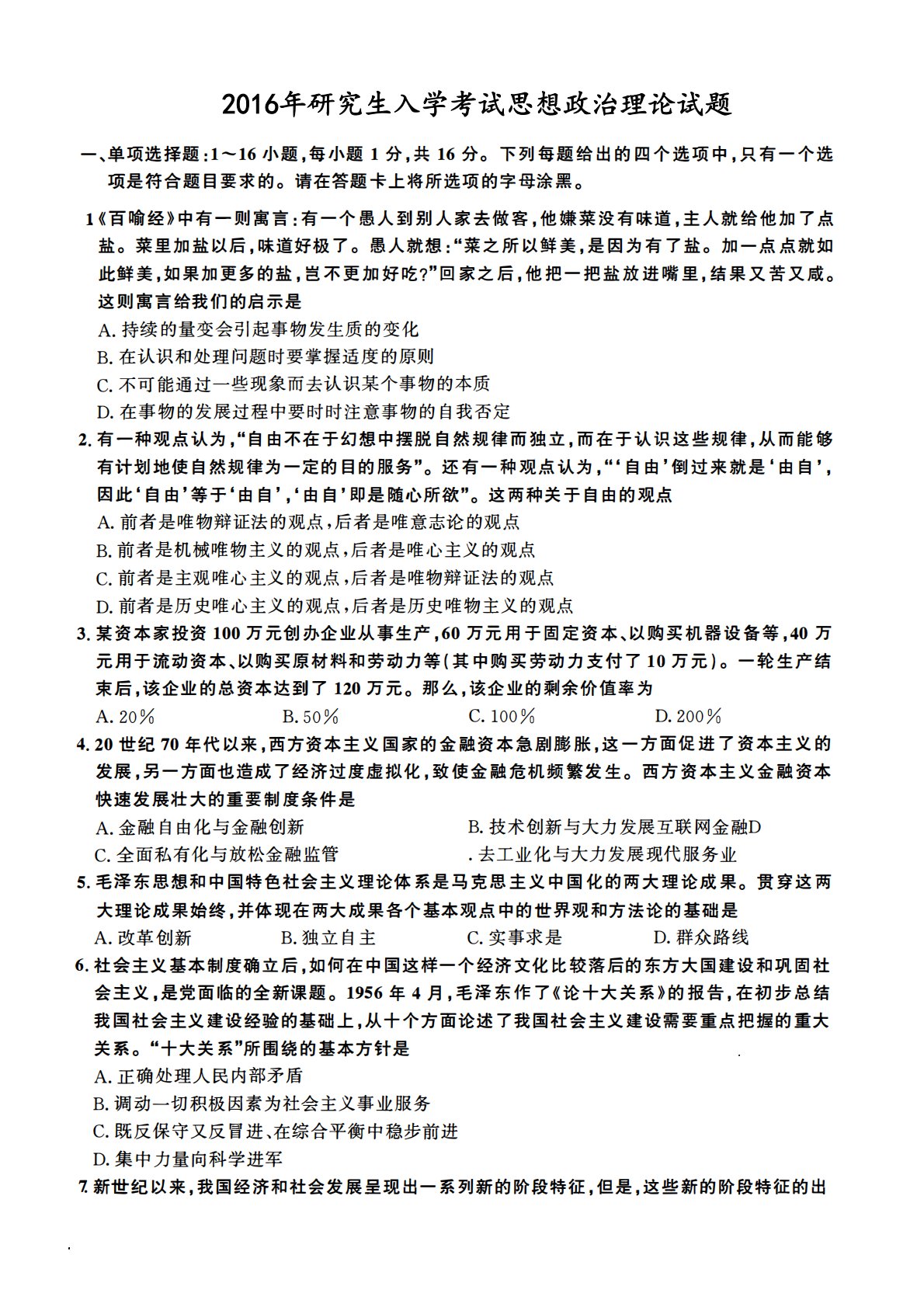 101政治2016年考研初试真题