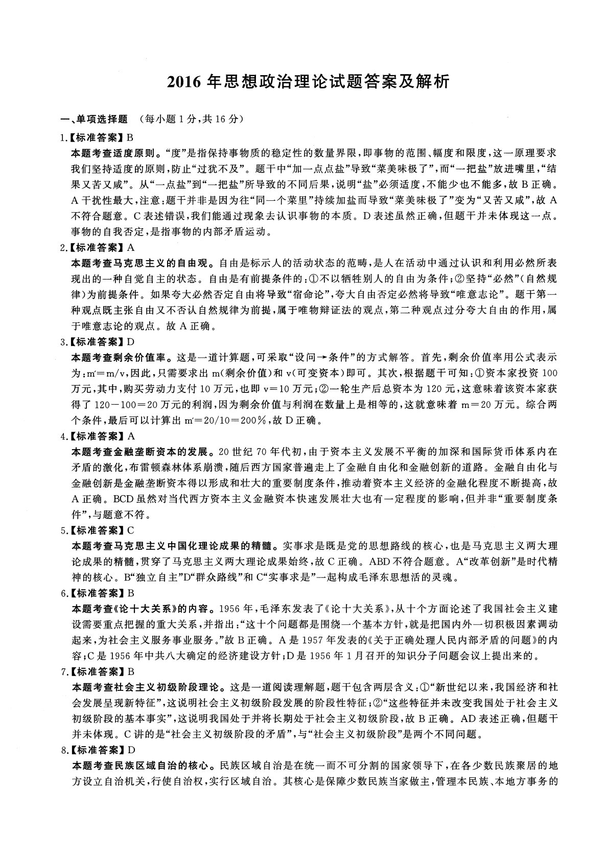 2016年思想政治理论试题答案及解析一、单项选择题(每小题1分,共16分)1.【标准答案】B本题考查适度原则。”度”是指保持事物质的稳定性的数量界限,即事物的范围、幅度和限度,这一原理要求我们坚持适度的原则,防止“过犹不及”。题干中“加一点点盐”导致”菜美味极了”,而“一把盐“放进嘴里,”结果又苦又咸”。从“一点盐”到“一把盐”所导致的不同后果,说明”盐”必须适度,不能少也不能多,故B正确。A干扰性最大,注意:题干并非是因为往“同一个菜里”持续加盐而导致”菜美味极了”变为”又苦又咸”,故A不符合题意。C表述错误,我们能通过现象去认识事物的本质。D表述虽然正确,但题干并未体现这一点。事物的自我否...