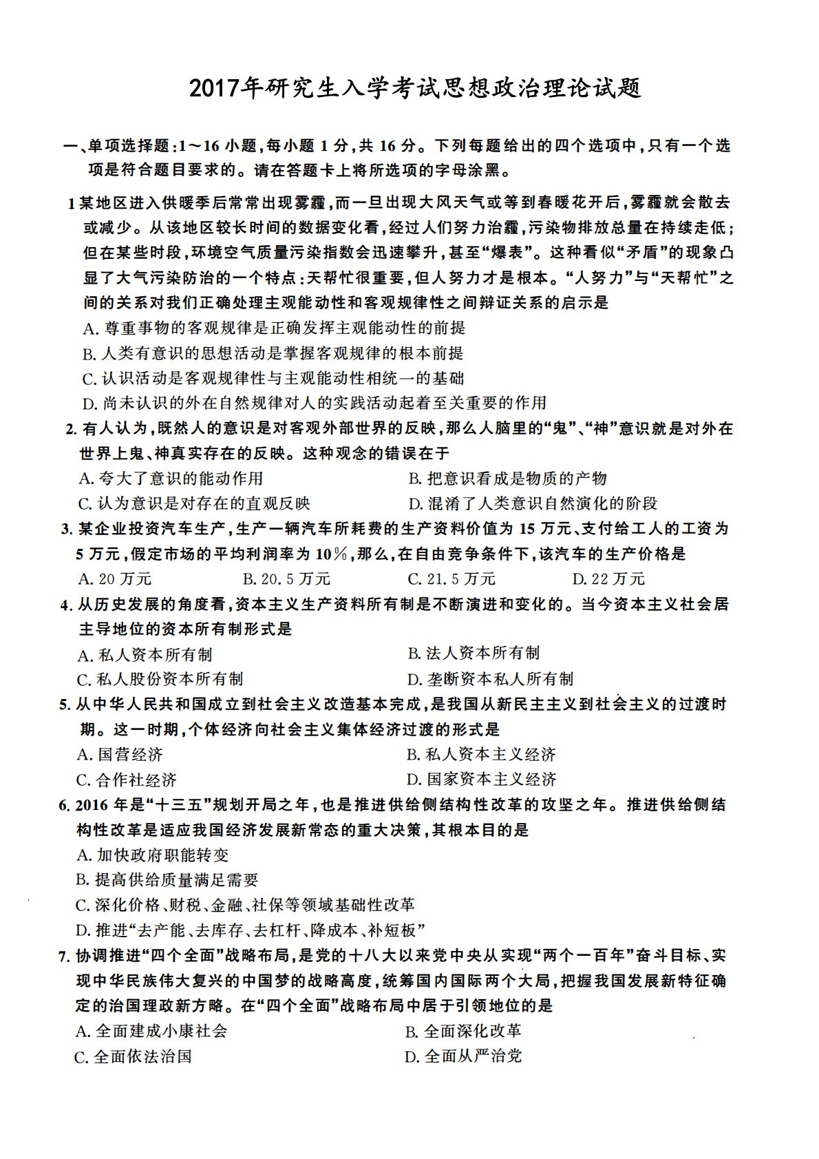 -、单项选择题:1-16小题,每小题1分,共16分。下列每题给出的四个选项中,只有一个选项是符合题目要求的。请在答题卡上将所选项的字母涂黑。1.某地区进入供暖季后常常出现雾霾,而一旦出现大风天气或等到春暧花开后,雾霾就会散去或减少。从该地区较长时间的数据变化看,经过人们努力治霾,污染物排放总量在持续走低;但在某些时段,环境空气质量污染指数会迅速攀升,甚至“爆表”。这种看似”矛盾”的现象凸显了大气污染防治的一个特点:天帮忙很重要,但人努力才是根本。”人努力”与“天帮忙”之间的关系对我们正确处理主观能动性和客观规律性之间辩证关系的启示是A.尊重事物的客观规律是正确发挥主观能动性的前提B.人类有意识...