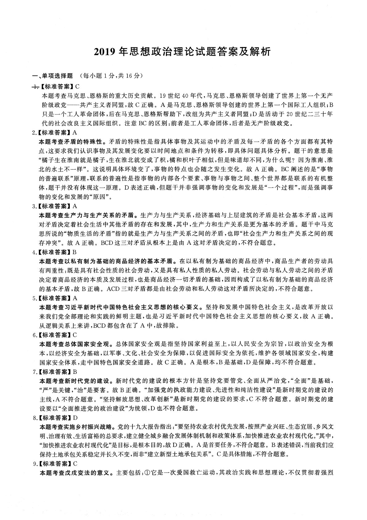 2019年思想政治理论试题答案及解析一、单项选择题(每小题1分,共16分)+.-【标准答案】C本题考查马克思、恩格斯的重大历史贡献。19世纪40年代,马克思、恩格斯领导创建了世界上第一个无产阶级政党共产主义者同盟,故C正确。A是马克思、恩格斯领导创建的世界上第一个国际工人组织;B只是一个工人革命团体,后在马克思、恩格斯帮助下,改组为共产主义者同盟;D是活动于20世纪二三十年代的社会改良主义国际组织。注意BC的区别:前者是工人革命团体,后者是无产阶级政党。2.【标准答案】A本题考查矛盾的特殊性。矛盾的特殊性是指具体事物及其运动中的矛盾及每一矛盾的各个方面都有其特点,这要求我们认识事物及其发展变化...