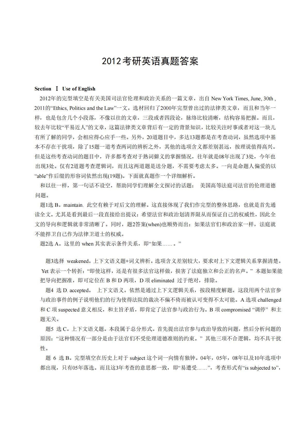 2012考研英语真题答案题2选A。这里的when其实表示条件关系,即“如果……。”题3选择weakened。上下文语义题+词义辨析。选项含义差别较大,要求对上下文逻辑关系掌握清楚。Yet表示一个转折:“即使这样,还是有很多法官这样做,损害了法庭独立和公正的名声。”本题如果能把导向把握准,即可定位在B和D两项,D项eliminated过于绝对,排除。题4选D.accepted。上下文语义。依然是通过上下文逻辑关系,按段精度解题。这段用两个法官参与政治事件的例子说明他们的行为使得法院的裁决不偏不倚而被认可变得不太可能。A选项challenged和C项suspected意义相反,和主旨矛盾,即肯定了...