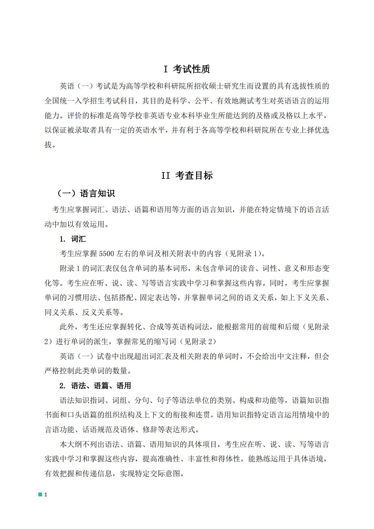 1I考试性质英语(一)考试是为高等学校和科研院所招收硕士研究生而设置的具有选拔性质的全国统一入学招生考试科目,其目的是科学、公平、有效地测试考生对英语语言的运用能力。评价的标准是高等学校非英语专业本科毕业生所能达到的及格或及格以上水平,以保证被录取者具有一定的英语水平,并有利于各高等学校和科研院所在专业上择优选拔。II考查目标(一)语言知识考生应掌握词汇、语法、语篇和语用等方面的语言知识,并能在特定情境下的语言活动中加以有效运用。1.词汇考生应掌握5500左右的单词及相关附表中的内容(见附录1)。附录1的词汇表仅包含单词的基本词形,未包含单词的读音、词性、意义和形态变化等。考生应在听、说、读、...
