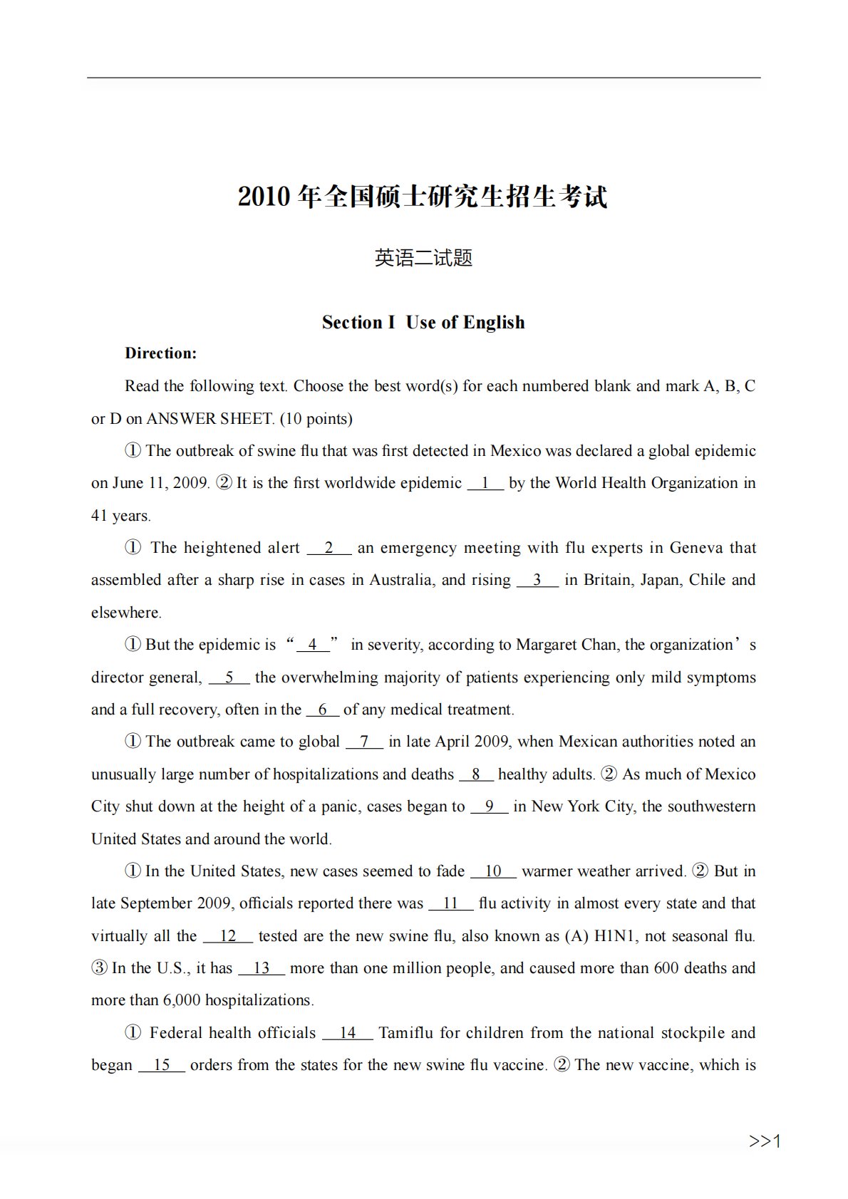 >>12010年全国硕士研究生招生考试英语二试题SectionIUseofEnglishDirection:Readthefollowingtext.Choosethebestword(s)foreachnumberedblankandmarkA,B,CorDonANSWERSHEET.(10points)①TheoutbreakofswinefluthatwasfirstdetectedinMexicowasdeclaredaglobalepidemiconJune11,2009.②Itisthefirstworldwideepidemic1bytheWorldHealthOrganization...
