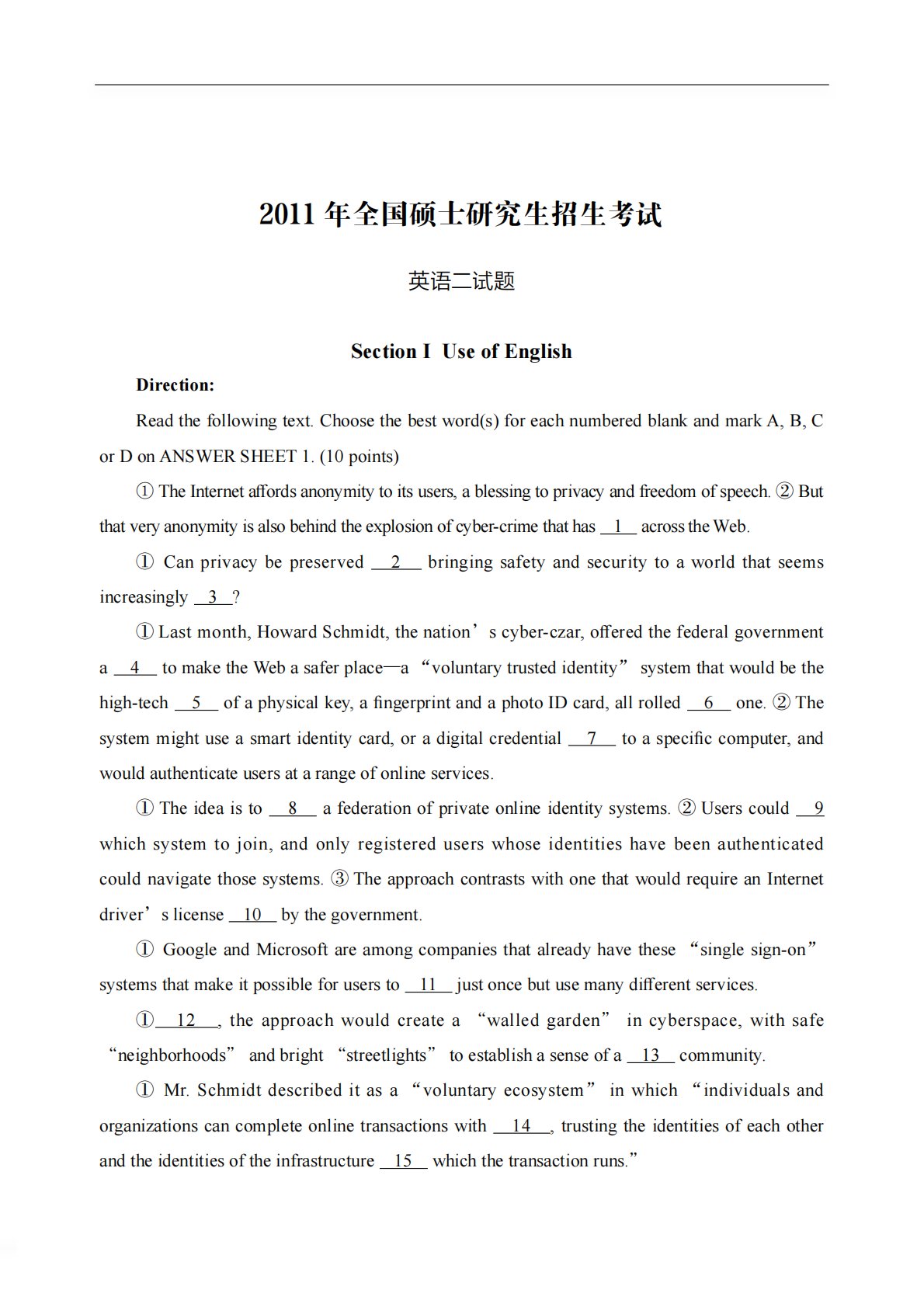 2011年全国硕士研究生招生考试英语二试题SectionIUseofEnglishDirection:Readthefollowingtext.Choosethebestword(s)foreachnumberedblankandmarkA,B,CorDonANSWERSHEET1.(10points)①TheInternetaffordsanonymitytoitsusers,ablessingtoprivacyandfreedomofspeech.②Butthatveryanonymityisalsobehindtheexplosionofcyber-crimethathas1across...