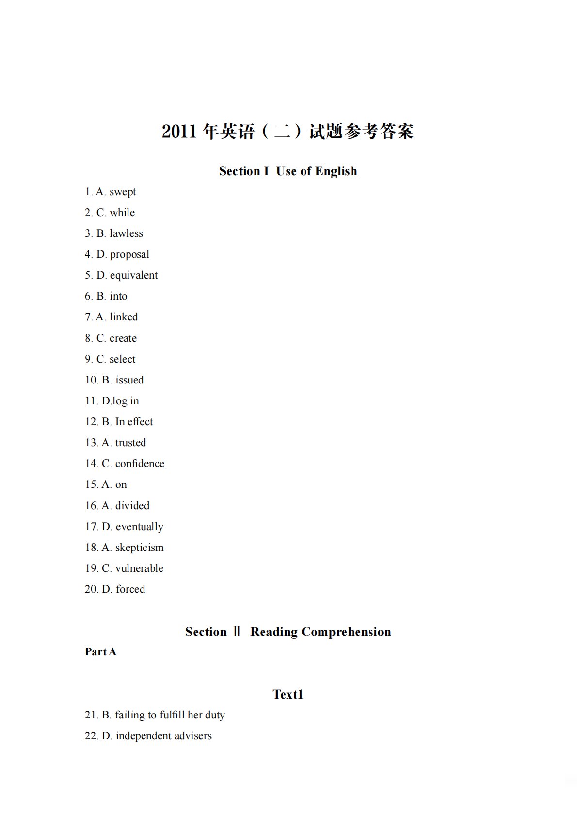 2011年英语(二)试题参考答案SectionIUseofEnglish1.A.swept2.C.while3.B.lawless4.D.proposal5.D.equivalent6.B.into7.A.linked8.C.create9.C.select10.B.issued11.D.login12.B.Ineffect13.A.trusted14.C.confidence15.A.on16.A.divided17.D.eventually18.A.skepticism19.C.vulnerable20.D.forcedSectionⅡReadingComprehensionPartATe...