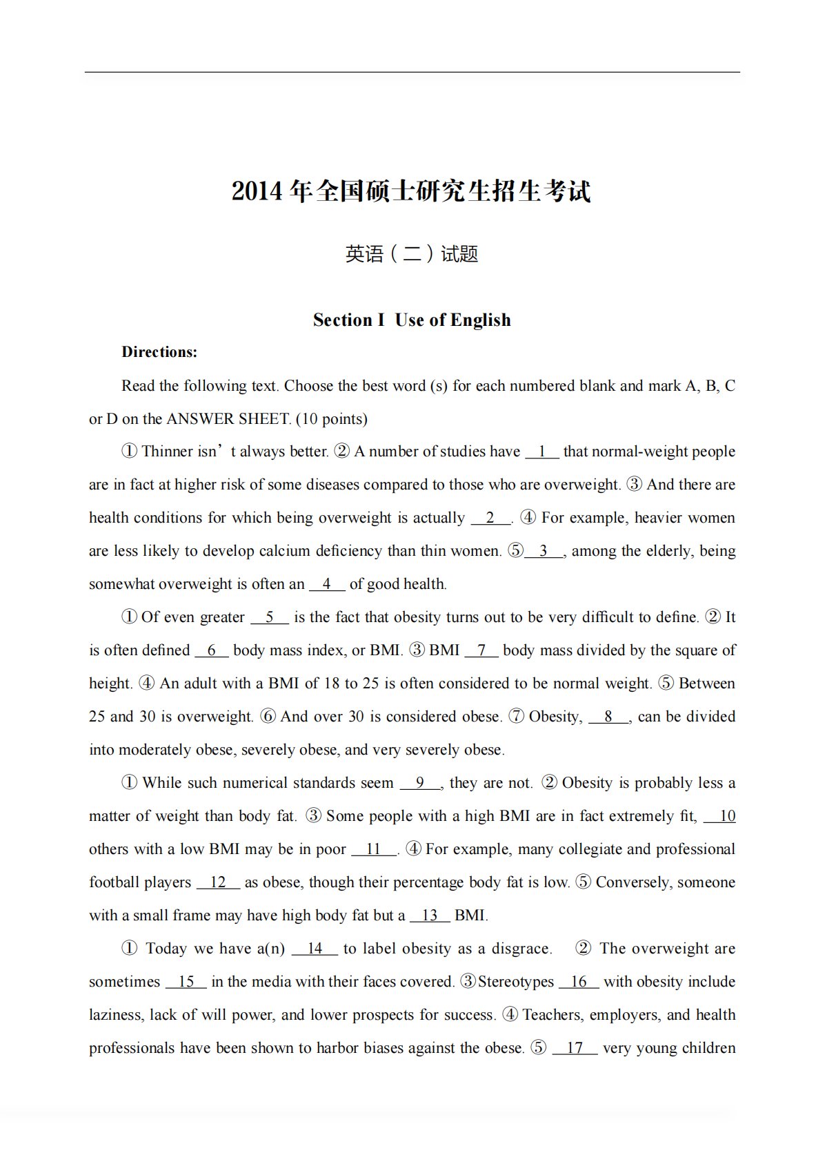 2014年全国硕士研究生招生考试英语(二)试题SectionIUseofEnglishDirections:Readthefollowingtext.Choosethebestword(s)foreachnumberedblankandmarkA,B,CorDontheANSWERSHEET.(10points)①Thinnerisn’talwaysbetter.②Anumberofstudieshave1thatnormal-weightpeopleareinfactathigherriskofsomediseasescomparedtothosewhoareoverweight.③Andt...