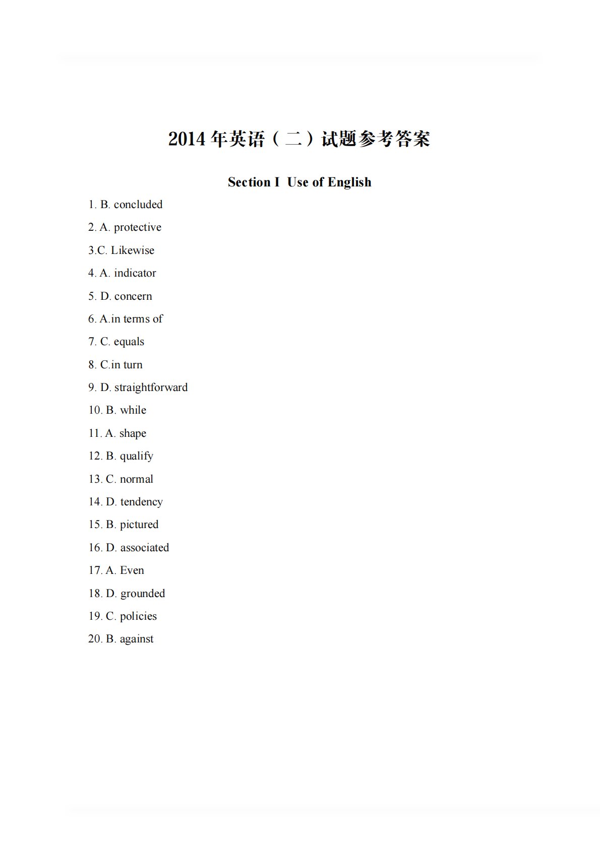 2014年英语(二)试题参考答案SectionIUseofEnglish1.B.concluded2.A.protective3.C.Likewise4.A.indicator5.D.concern6.A.intermsof7.C.equals8.C.inturn9.D.straightforward10.B.while11.A.shape12.B.qualify13.C.normal14.D.tendency15.B.pictured16.D.associated17.A.Even18.D.grounded19.C.policies20.B.againstSectionⅡReadingCom...