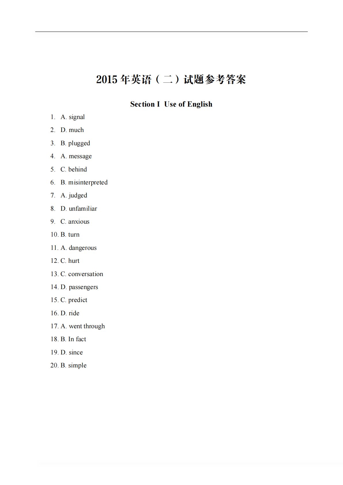 2015年英语(二)试题参考答案SectionIUseofEnglish1.A.signal2.D.much3.B.plugged4.A.message5.C.behind6.B.misinterpreted7.A.judged8.D.unfamiliar9.C.anxious10.B.turn11.A.dangerous12.C.hurt13.C.conversation14.D.passengers15.C.predict16.D.ride17.A.wentthrough18.B.Infact19.D.since20.B.simpleSectionⅡReadingComprehension...