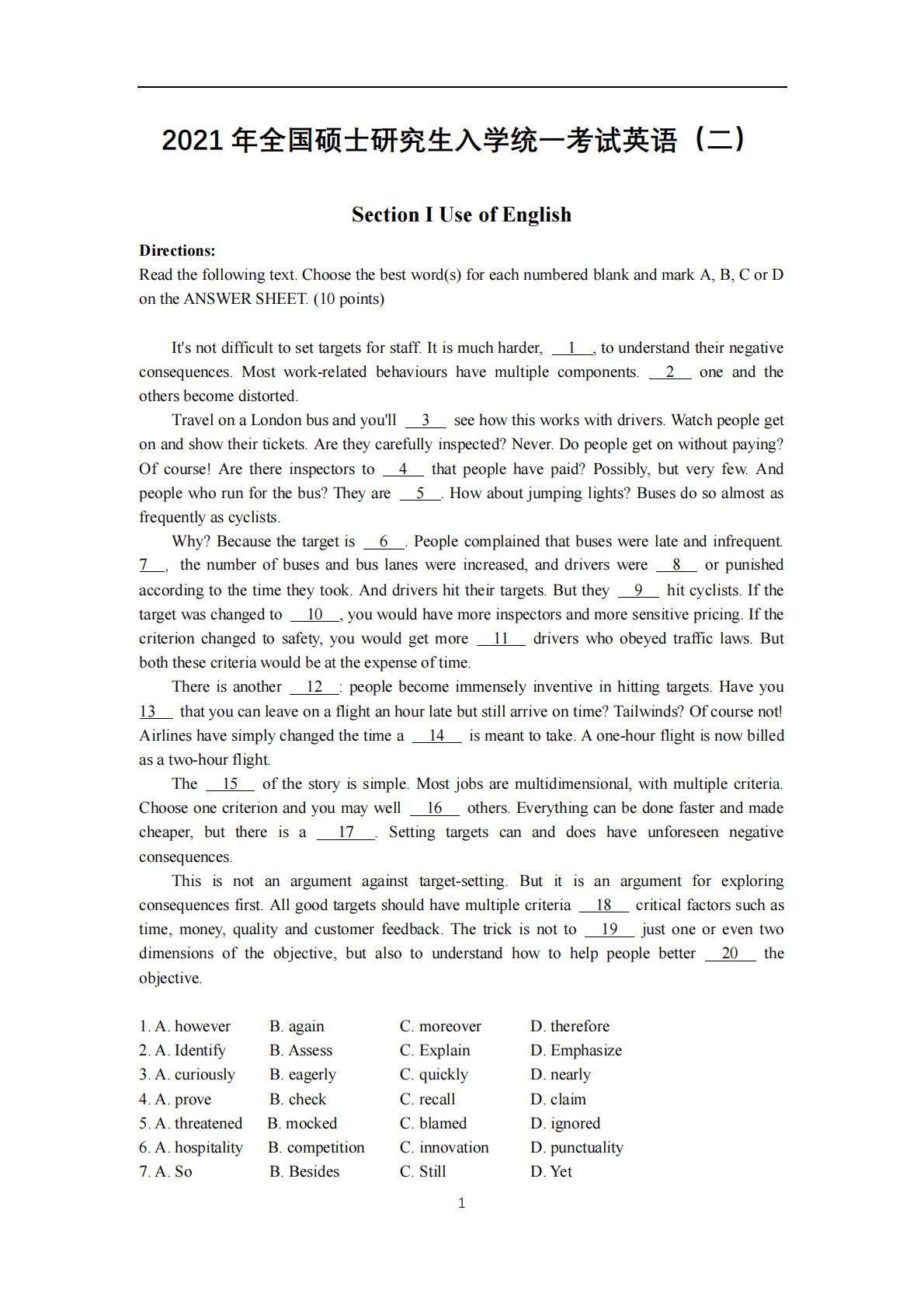 1SectionI2021年全国硕士研究生入学统一考试英语(二)UseofEnglishDirections:Readthefollowingtext.Choosethebestword(s)foreachnumberedblankandmarkA,B,CorDontheANSWERSHEET.(10points)It'snotdifficulttosettargetsforstaff.Itismuchharder,1,tounderstandtheirnegativeconsequences.Mostwork-relatedbehaviourshavemultiplecomponents.2...