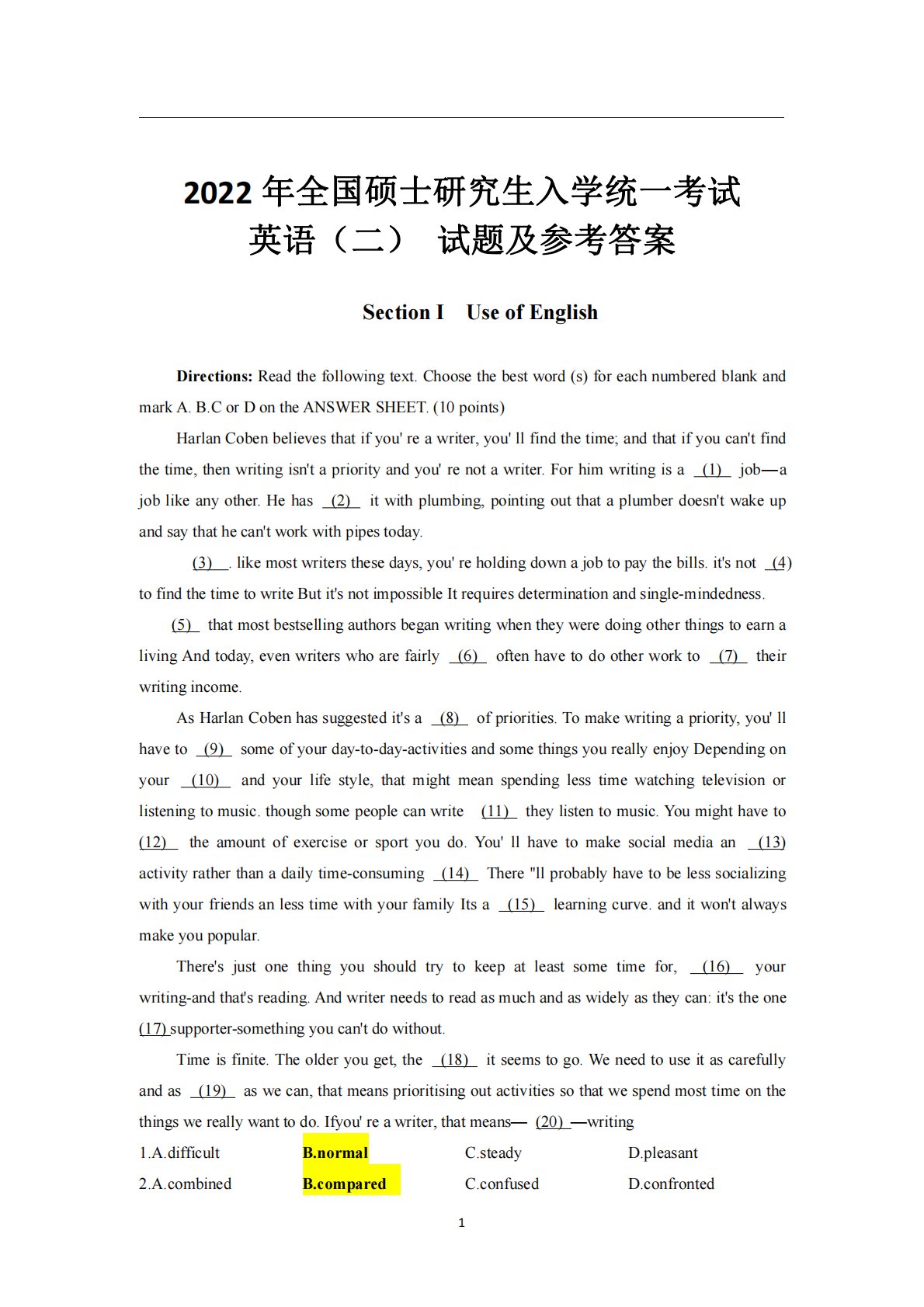 12022年全国硕士研究生入学统一考试英语(二)试题及参考答案SectionIUseofEnglishDirections:Readthefollowingtext.Choosethebestword(s)foreachnumberedblankandmarkA.B.CorDontheANSWERSHEET.(10points)HarlanCobenbelievesthatifyou'reawriter,you'llfindthetime;andthatifyoucan'tfindthetime,thenwritingisn'tapriorityandyou'renotawriter.Forh...