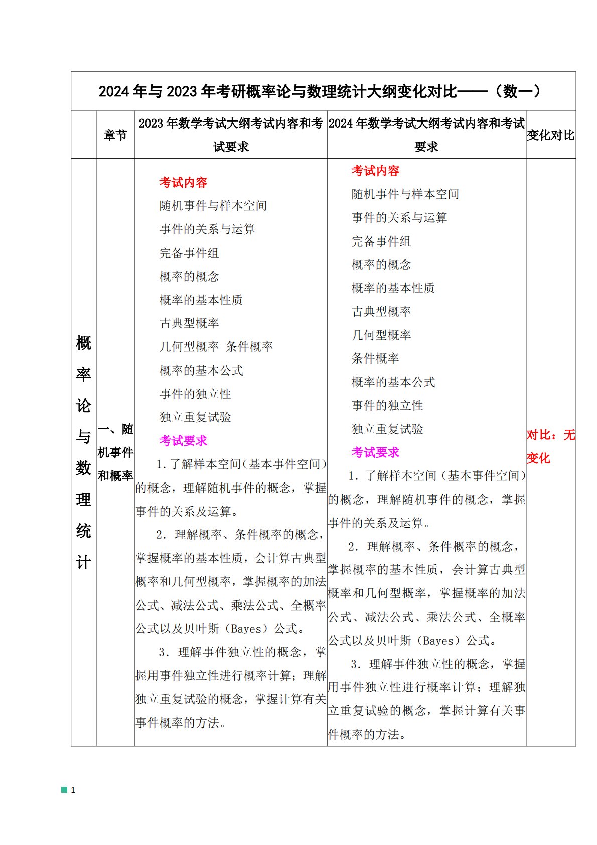 301数学一2024、2023年考研概率论与数理统计大纲变化对比表
