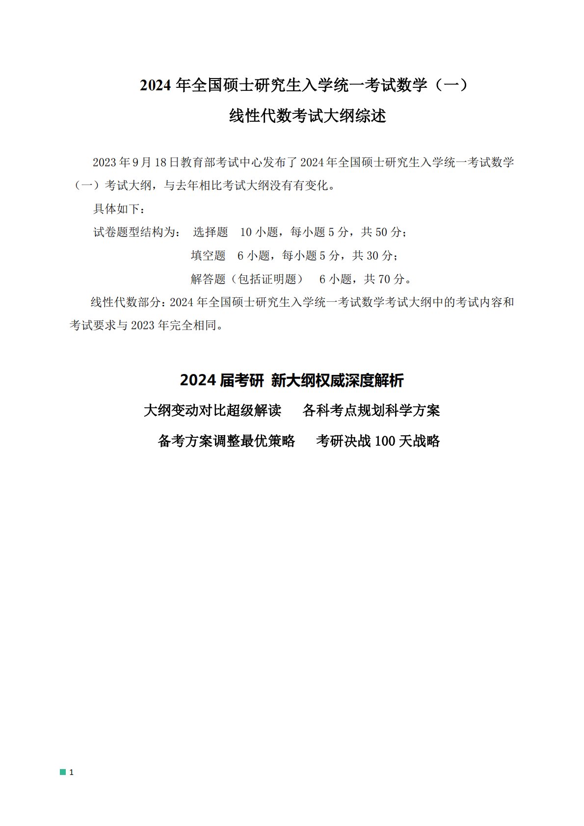 12024年全国硕士研究生入学统一考试数学(一)线性代数考试大纲综述2023年9月18日教育部考试中心发布了2024年全国硕士研究生入学统一考试数学(一)考试大纲,与去年相比考试大纲没有有变化。具体如下:试卷题型结构为:选择题10小题,每小题5分,共50分;填空题6小题,每小题5分,共30分;解答题(包括证明题)6小题,共70分。线性代数部分:2024年全国硕士研究生入学统一考试数学考试大纲中的考试内容和考试要求与2023年完全相同。2024届考研新大纲权威深度解析大纲变动对比超级解读各科考点规划科学方案备考方案调整最优策略考研决战100天战略百校文库—海量高校资料共享库百校文库是一个线上大学...