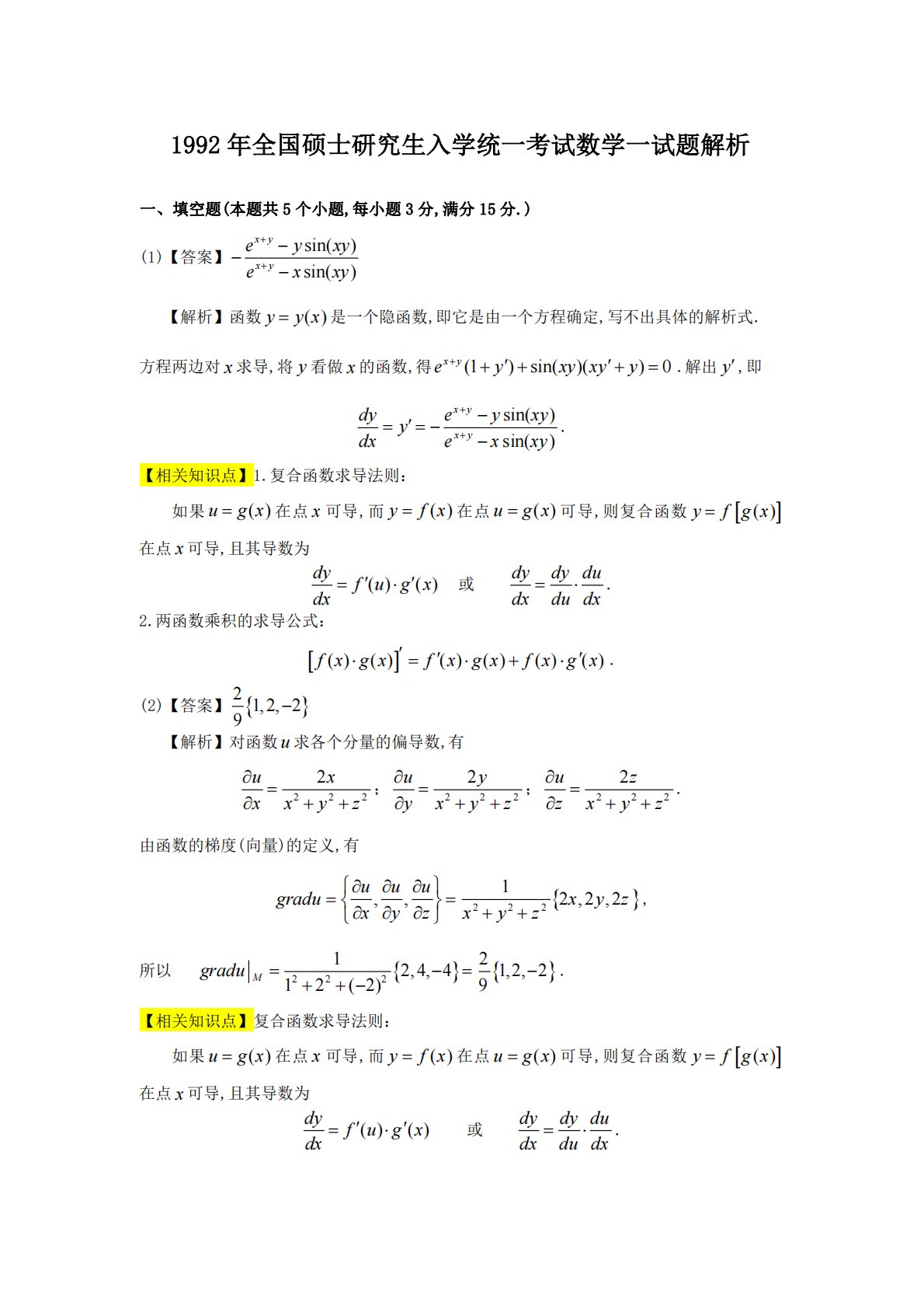 1992年全国硕士研究生入学统一考试数学一试题解析一、填空题(本题共5个小题,每小题3分,满分15分.)(1)【答案】sin()sin()xyxyeyxyexxy【解析】函数()yyx是一个隐函数,即它是由一个方程确定,写不出具体的解析式.方程两边对x求导,将y看做x的函数,得(1)sin()()0xyeyxyxyy.解出y,即sin()sin()xyxydyeyxyydxexxy.【相关知识点】1.复合函数求导法则:如果()ugx在点x可导,而()yfx在点()ugx可导,则复合函数()yfgx在点x可导,且其导数为()()dyfugx...