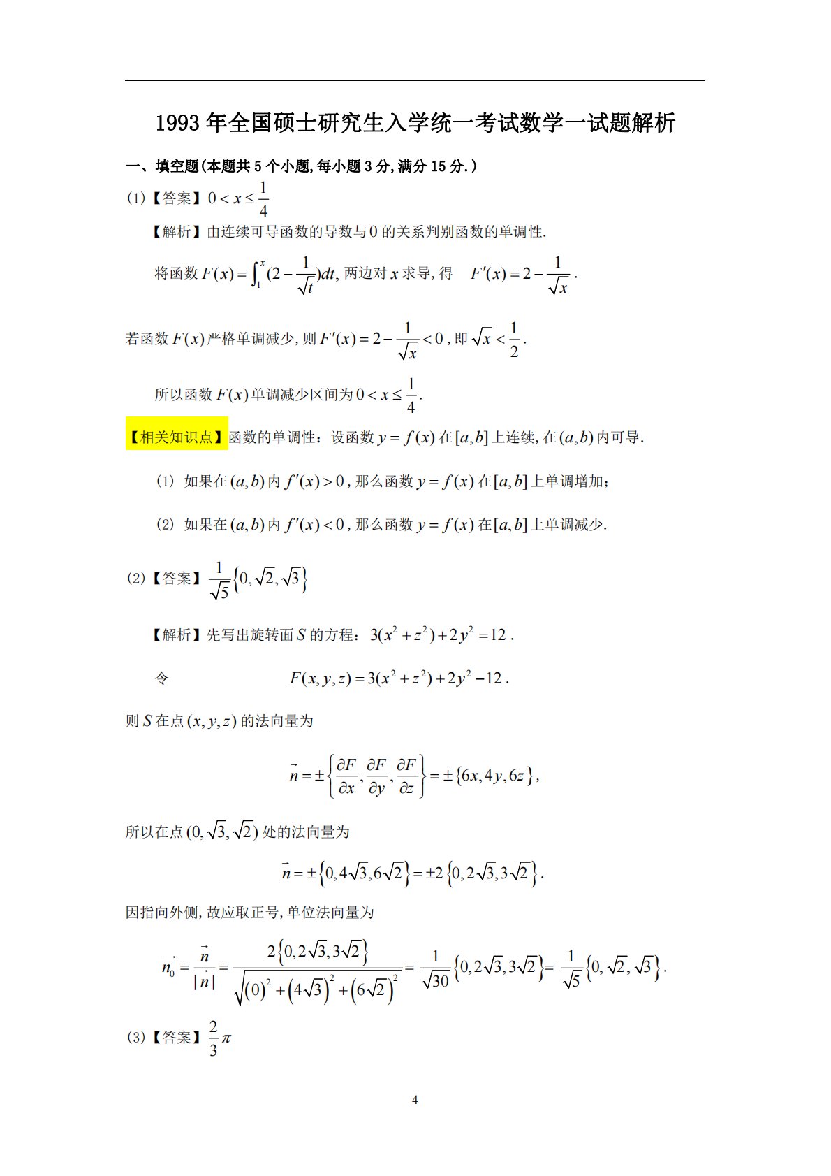 41993年全国硕士研究生入学统一考试数学一试题解析一、填空题(本题共5个小题,每小题3分,满分15分.)(1)【答案】104x【解析】由连续可导函数的导数与0的关系判别函数的单调性.将函数11()(2),xFxdtt两边对x求导,得1()2Fxx.若函数()Fx严格单调减少,则1()20Fxx,即12x.所以函数()Fx单调减少区间为104x.【相关知识点】函数的单调性:设函数()yfx在[,]ab上连续,在(,)ab内可导.(1)如果在(,)ab内()0fx,那么函数()yfx在[,]ab上单调增加;(2)如果在(,)ab内()0fx,那么函数()...