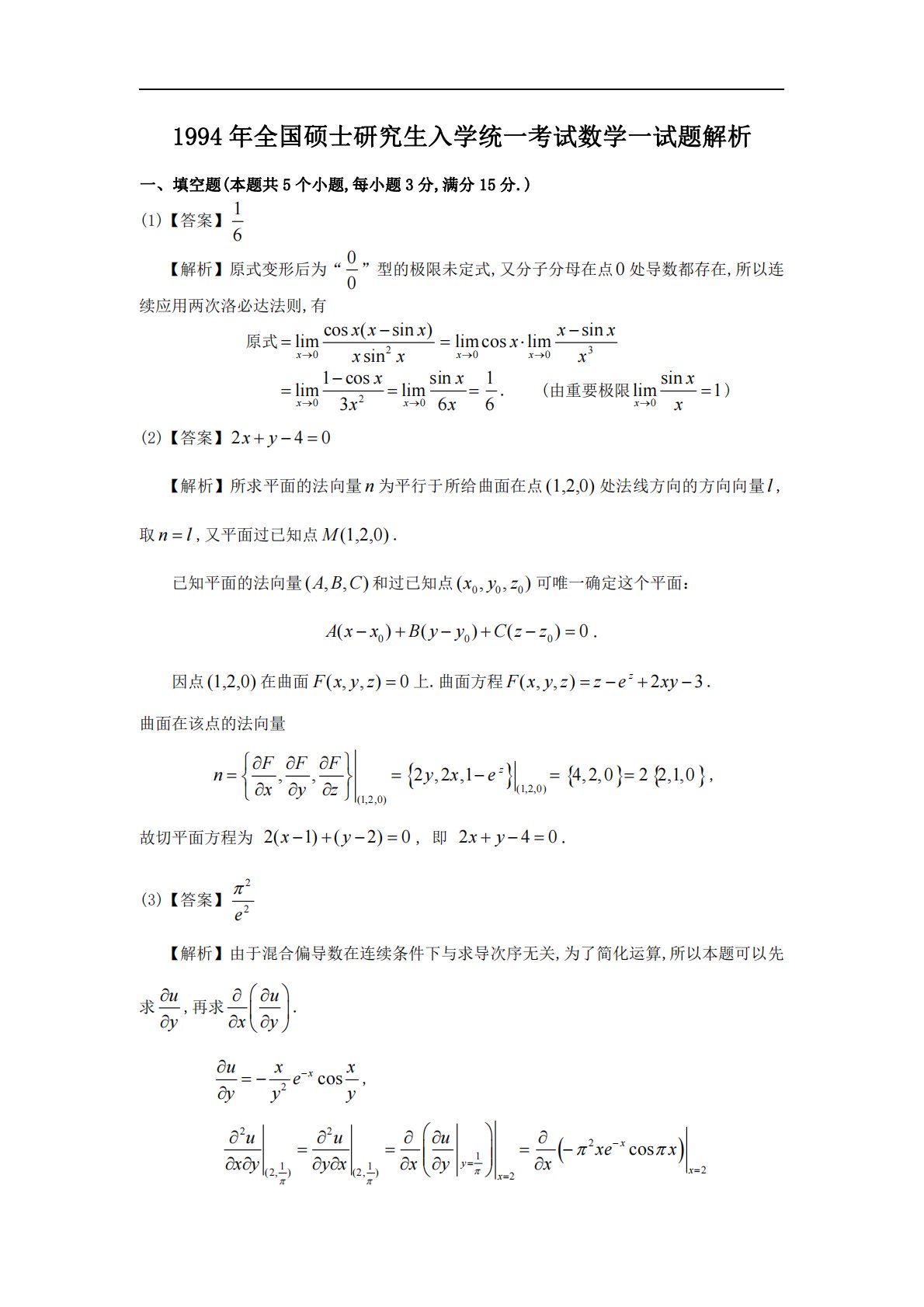 1994年全国硕士研究生入学统一考试数学一试题解析一、填空题(本题共5个小题,每小题3分,满分15分.)(1)【答案】16【解析】原式变形后为“00”型的极限未定式,又分子分母在点0处导数都存在,所以连续应用两次洛必达法则,有原式20cos(sin)limsinxxxxxx300sinlimcoslimxxxxxx2001cossin1limlim366xxxxxx.(由重要极限0sinlim1xxx)(2)【答案】240xy【解析】所求平面的法向量n为平行于所给曲面在点(1,2,0)处法线方向的方向向量l,取nl,又平面过已知点(1,2,0)M.已知平...