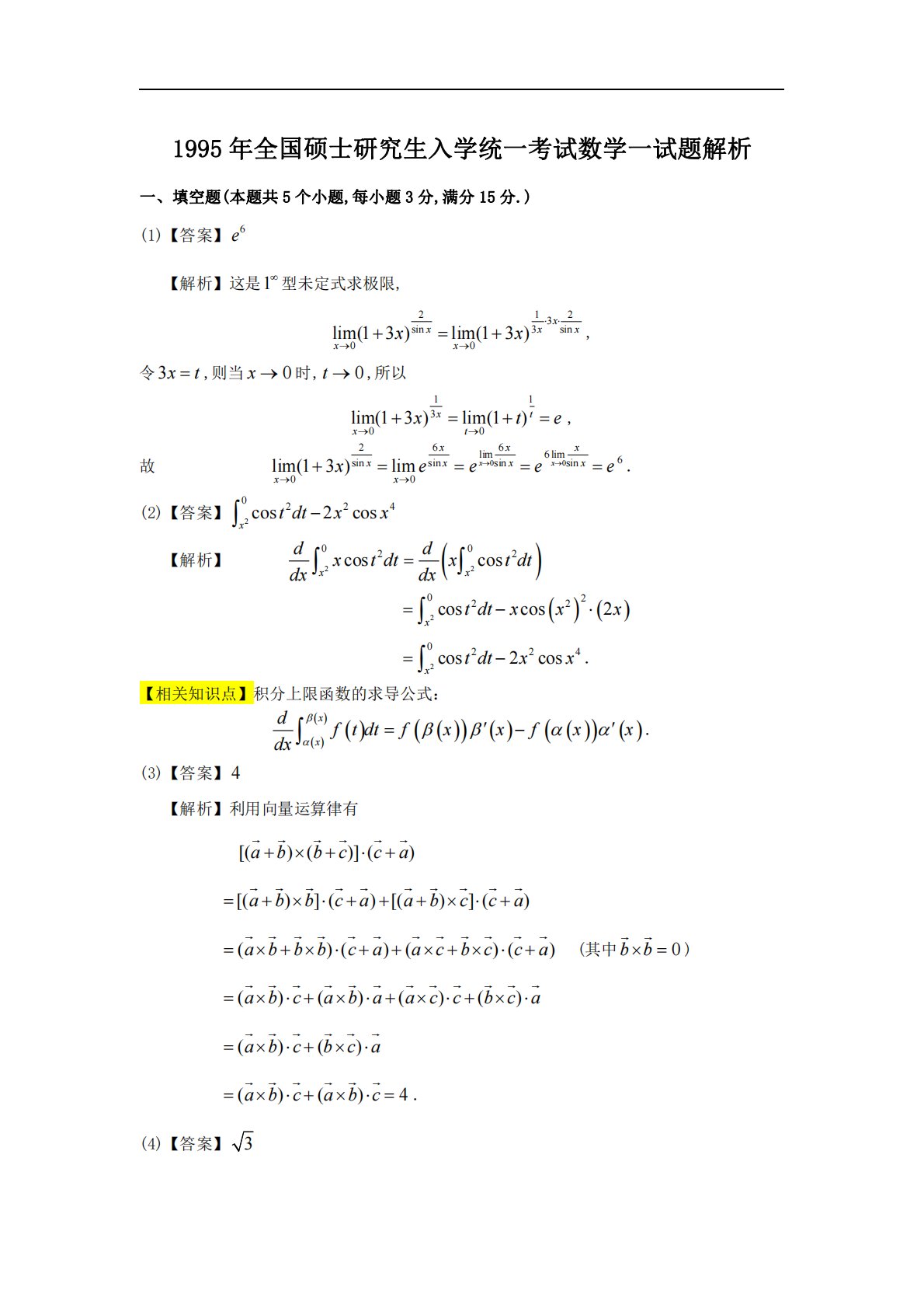 1995年全国硕士研究生入学统一考试数学一试题解析一、填空题(本题共5个小题,每小题3分,满分15分.)(1)【答案】6e【解析】这是1型未定式求极限,2123sin3sin00lim(13)lim(13)xxxxxxxx,令3xt,则当0x时,0t,所以11300lim(13)lim(1)xtxtxte,故00266lim6lim6sinsinsinsin00lim(13)limxxxxxxxxxxxxeeee.(2)【答案】20224cos2cosxtdtxx【解析】220022coscosxxddxtdtxtdtdxdx...