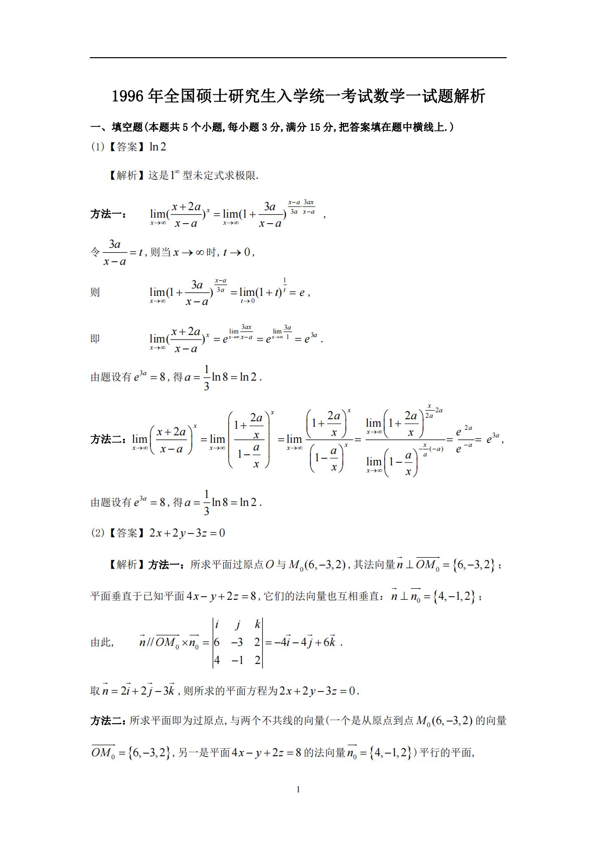 11996年全国硕士研究生入学统一考试数学一试题解析一、填空题(本题共5个小题,每小题3分,满分15分,把答案填在题中横线上.)(1)【答案】ln2【解析】这是1型未定式求极限.方法一:3323lim()lim(1)xaaxxaxaxxxaaxaxa,令3atxa,则当x时,0t,则1303lim(1)lim(1)xaatxtatexa,即33limlim312lim()xxaxaxaxaxxaeeexa.由题设有38ae,得1ln8ln23a.方法二:2223()2221lim112limlimlim11li...