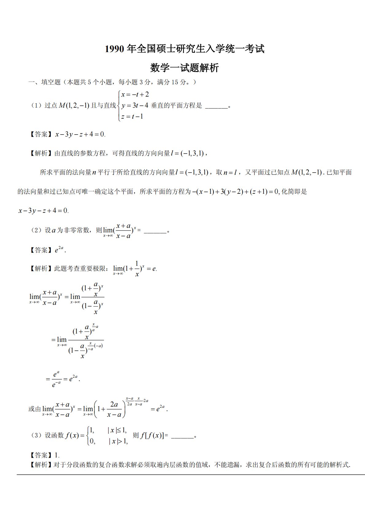 1990年全国硕士研究生入学统一考试数学一试题解析一、填空题(本题共5个小题,每小题3分,满分15分。)(1)过点(1,2,1)M且与直线2341xtytzt垂直的平面方程是_______。【答案】340.xyz【解析】由直线的参数方程,可得直线的方向向量(1,3,1)l,所求平面的法向量n平行于所给直线的方向向量(1,3,1)l,取nl,又平面过已知点(1,2,1)M.已知平面的法向量和过已知点可唯一确定这个平面,所求平面的方程为(1)3(2)(1)0,xyz化简即是340.xyz(2)设a为非零常数,则lim()xxxax...
