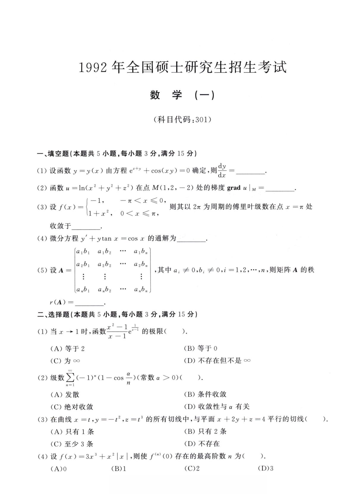 301数学一1992年考研初试真题
