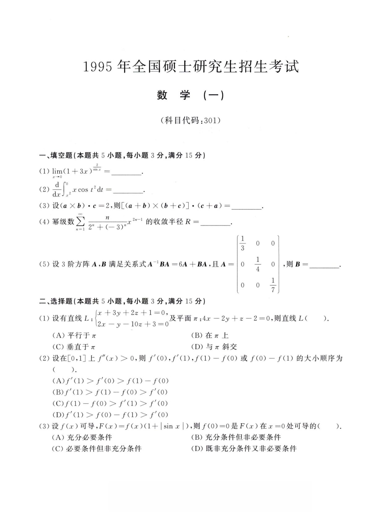 01995年全国硕士研究生招生考试数学(一)(科目代码:301)一、填空题(本题共5小题,每小题3分,满分15分)2(1)lim(l+3工)砧=.dr°(2)-—xcost2At=.cLcJ,-------------(3)设(aXb)•c=2?则[(a+b)X(b+c)]•(c+a)=________.(4)幕级数£…:。、”严的收敛半径R=________•T0(5)设3阶方阵满足关系式A^BA=6A+BA,且人=0丄400二、选择题(本题共5小题,每小题3分,满分15分)(1)设有直线L:]+'十十及平面兀:4鼻一2夕+z—2=0,则直线L().【2工一y一10z+3=0(A)平行于兀(...