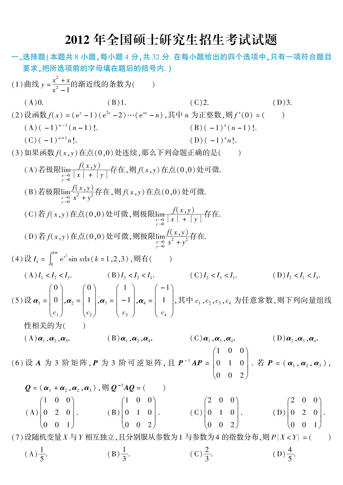 301数学一2012年考研初试真题