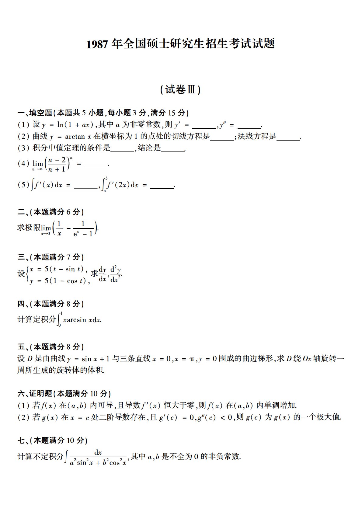 1987年全国硕士研究生招生考试试题(试卷皿)-、填空题(本题共5小题,每小题3分,满分15分)(1)设y=In(1+ax),其中a为非零常数,则y'=,y"=(2)曲线y=arctanx在横坐标为1的点处的切线方程是;法线方程是.(3)积分中值定理的条件是,结论是.(4)lim(n-2r=n--+ocn+l(5)ff'(x)dx=,ff'(2x)dx=.二、(本题满分6分)求极限lim(11x----t()了-ex-1).三、(本题满分7分)设{x=5(t-sint),求少心y=5(1-cost),dx'dx2·四、(本题满分8分)计算定积分rxarcsinxdx.。五、(本题满分8分)设D...