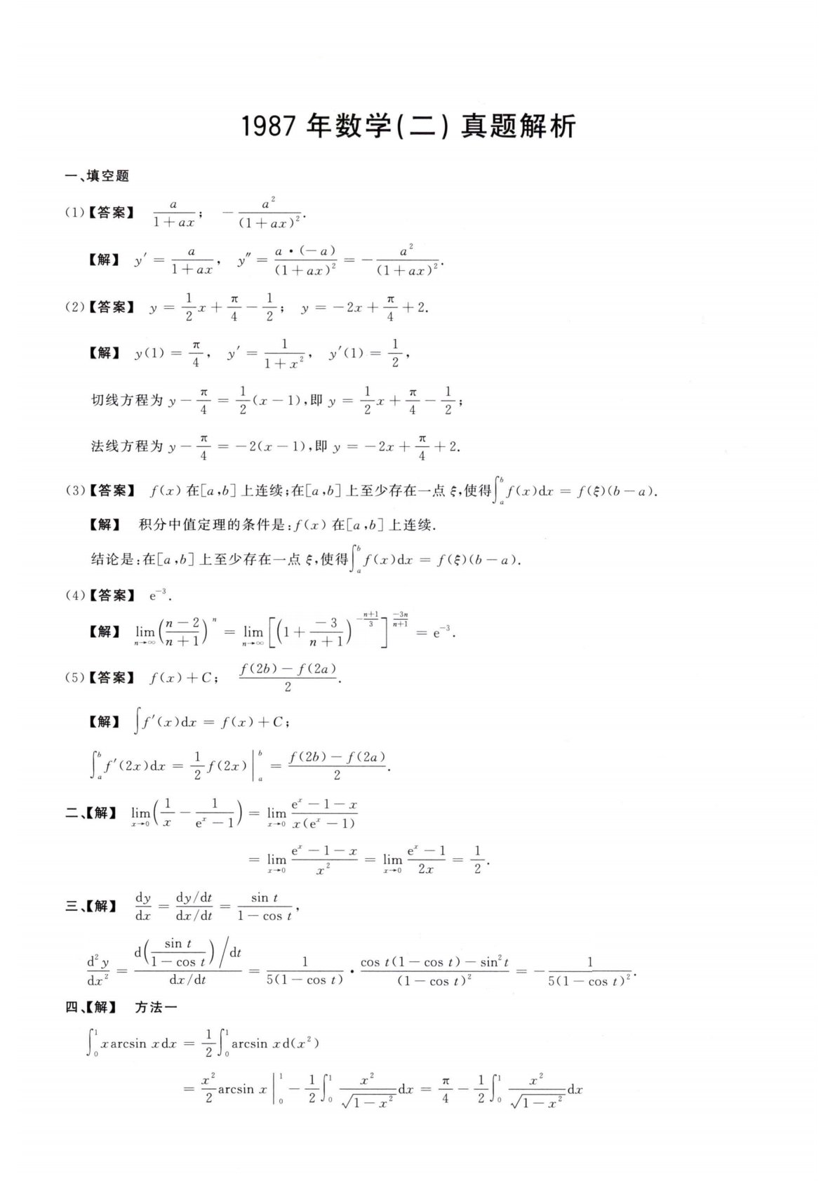 1987年数学(二)真题解析一、填空题(1)【答案】a1ax(1+ax)2(5)【答案】八工)+C;【解】J/Z(x)dj:=/(J7)+C;[八2”=*心)[=心);心).【解】“=二£—1十axa・(—a)_a2(1~hax)2(1~had:)2(2)【答案】y=—j:+----------;y=—2a:+—+2.【解】y(l)=+,“=12'“⑴=4",41十£/切线方程为y——=*(工一1),艮卩y=+------;法线方程为夕—=—2(工一1),即,=—2工+于+2.(3)【答案】fS在匕"]上连续;在[a,b]上至少存在一点&使得/(^)dz=—Ja【解】积分中值定理的条件是:/'...