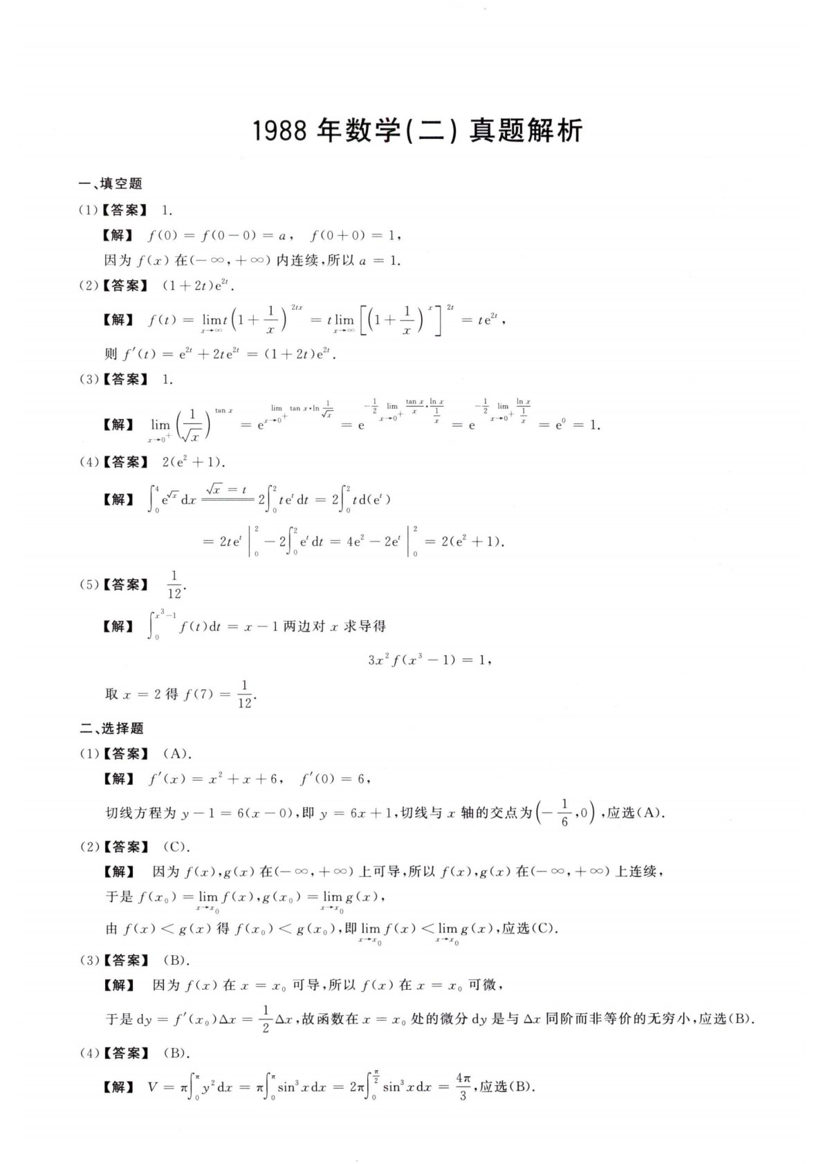 1988年数学(二)真题解析—、填空题(1)【答案】1.【解】/(0)=/(0—0)=a,/(0+0)=1,因为/'(工)在(―°°,+°°)内连续,所以a=1.(2)【答案】(l+2t)e".【解】fCt)=lim/(1+—)■zf8\x/Ztx=tlim2t+则/(O=/+2te2t=(l+2z)e2\(3)【答案】1.【解】limlimtanx»lne—ylim—o+e~r"Ilim.el。Mj=1.(4)【答案】2(e2+1).【解】*22Jteldt=21)00=2te=2(e2+1).02eAt=4e2—2ez0202(5)【答案】1【解】1f(t)dt=jc—1两边对x求导得10...
