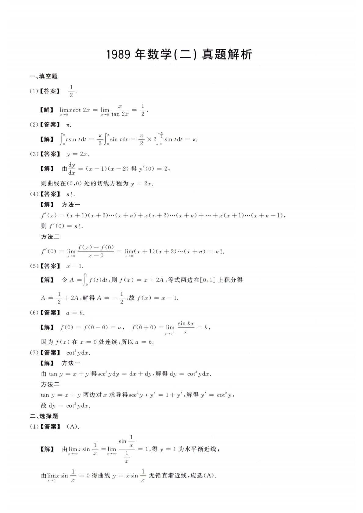 1989年数学(二)真题解析一、填空题(1)【答案】y.1[解]limjrcot2工=lim-----—=—.x-*or-*otan2jc2(2)【答案】7T.【解】sintdt=sintdt=X22sintdt=兀・Jo2Jo2Jo(3)【答案】y=2w・【解】由学=(乂一1)(无一2)得;y'(O)=2,dx则曲线在(0,0)处的切线方程为夕=2工・(4)【答案】n!.【解】方法一f=(无+1)(工+2)…(工十Z?)++2)・•・(2+72)+…+H(H+1)・・•(工+X—1),则/(0)=Z?!.方法二(0)=lim了Q")---f°)=lim(j;+1)(工+2)・・・(乂+卅)=...