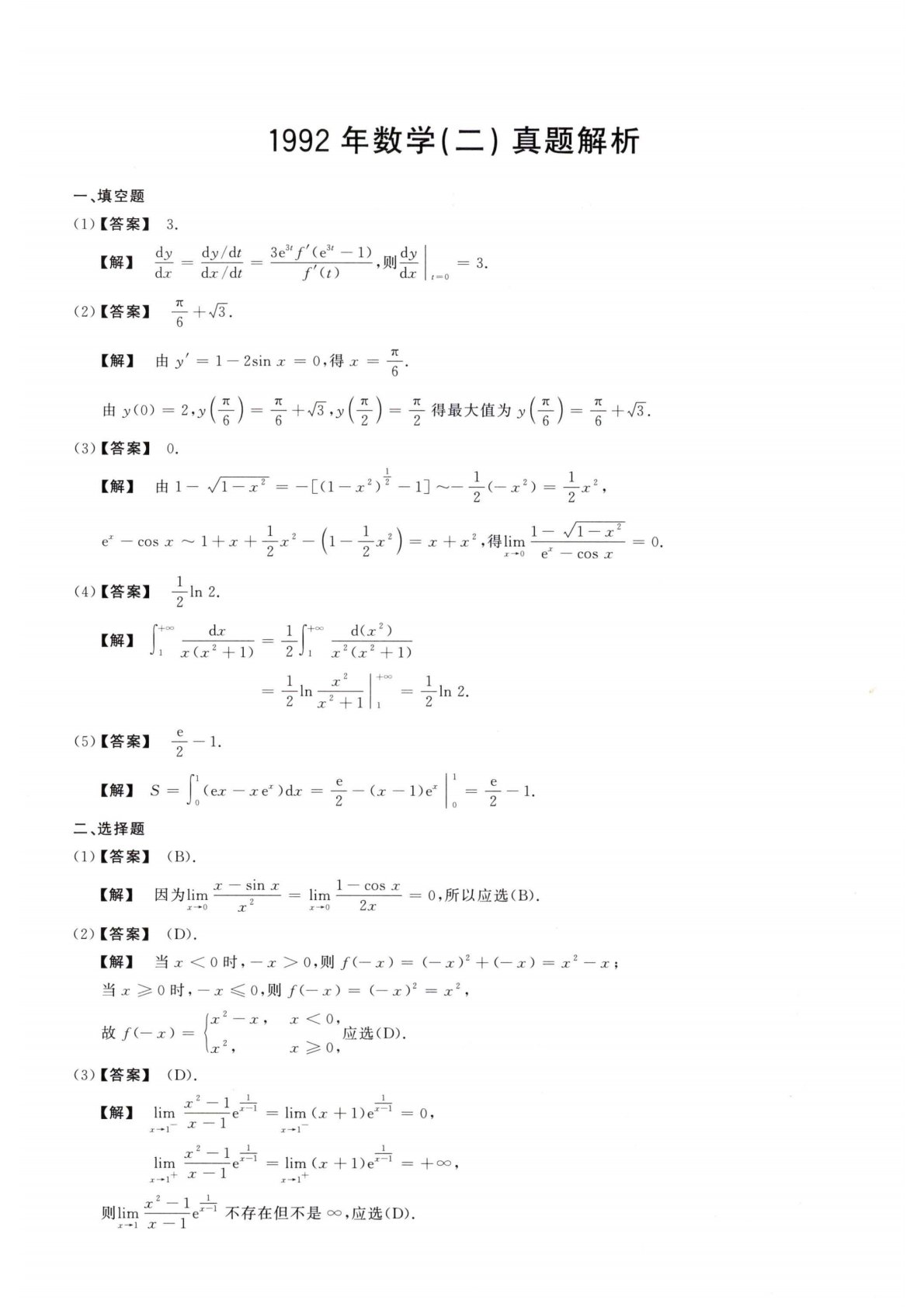 1992年数学(二)真题解析一、填空题(1)【答案】3.【解】dyAy/At3e3(//(e3t—1)dj/1ndjcAx/dz/Z(z)'Ajc11=0(2)【答案】-=-+73.6【解】由yf=1一2sinx=0,得x=学・6由y(O)=2,y(*)=-y+73*,y(守)=-y-得最大值为y(令)=罟+站.⑶【答案】0._______丄11【解】由1—a/1—X2=—[(1—JC2)2—1]~(—J:2)=—2,2_q丄则lim不存在但不是a,应选(D).X—1X—1ex—cosx〜1+工+寺工2一(1----x2)=工+工2,得Hmi—-------------^―2\2丿工•*oex...