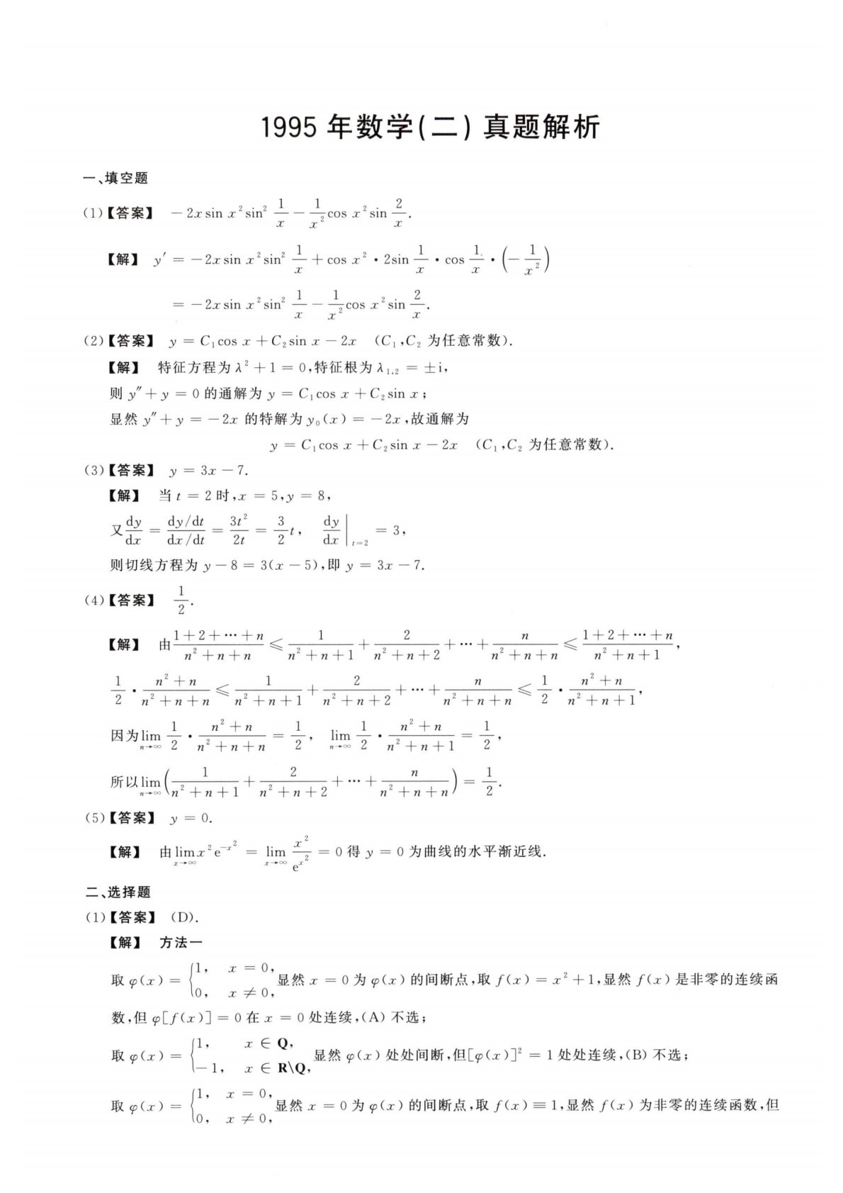 1995年数学(二)真题解析一、填空题(1)【答案】—sin2sin2---------cosj:2sinXJCX【解】yf=—2工sinx2sin2—--\-cosjc2•2sin—•cos—jcxx=-2xsin^2sin2-——cos2sin—.JCXJC(2)【答案】y=C1Cos+C2sin乂一2h(C】,C2为任意常数).【解】特征方程为A2+l=0,特征根为心,2=士i,则yf+y=0的通解为歹=C1cos工+C2sinx;显然yr+y=—2工的特解为歹0(工)=—2工,故通解为y=Cxcosx+C2sinx—2x(Cj,C2为任意常数).(3)【答案】y=—1.【解】当t=2时...