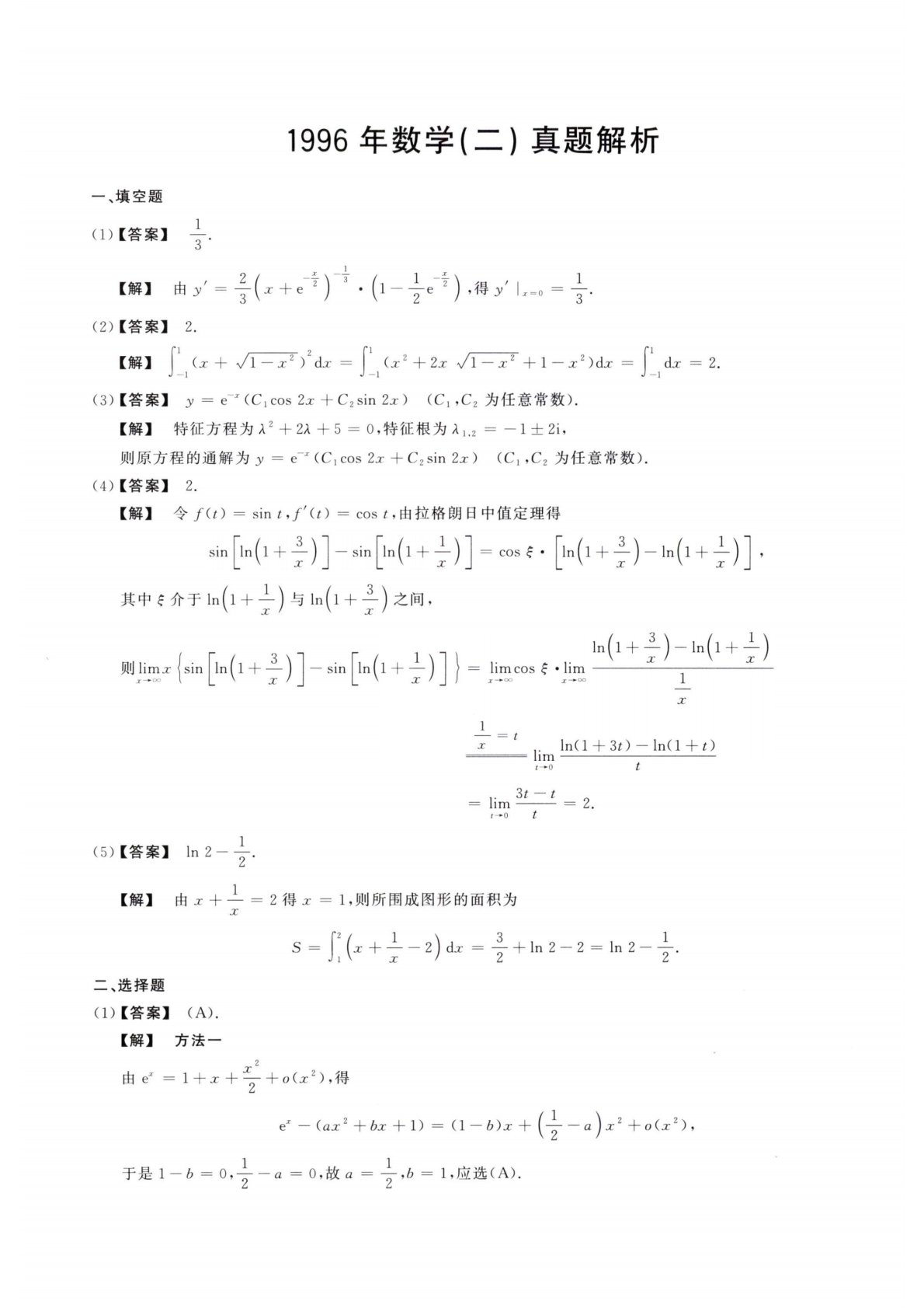 1996年数学(二)真题解析一、填空题(1)【答案】y.x_丄工[解]由y'=#(z+e2)」•(1__e2),得y'|乂=0=y.(2)【答案】2.【解】[(工+\/1—x2)dr=[(/+2工J_无?+]—于)山=[dz=2.J-iJ-iJ-i(3)【答案】y=e~J(C1Cos2工+C2sin2工)(Cl,C2为任意常数).【解】特征方程为A2+2A+5=0,特征根为入】,2=—l±2i,则原方程的通解为夕=e-x(C1Cos2工+C2sin2工)(C,,C2为任意常数).(4)【答案】2.【解】令/(£)=sint,/'(/)=cost,由拉格朗日中值定理得=cosE其中W介于ln(l...