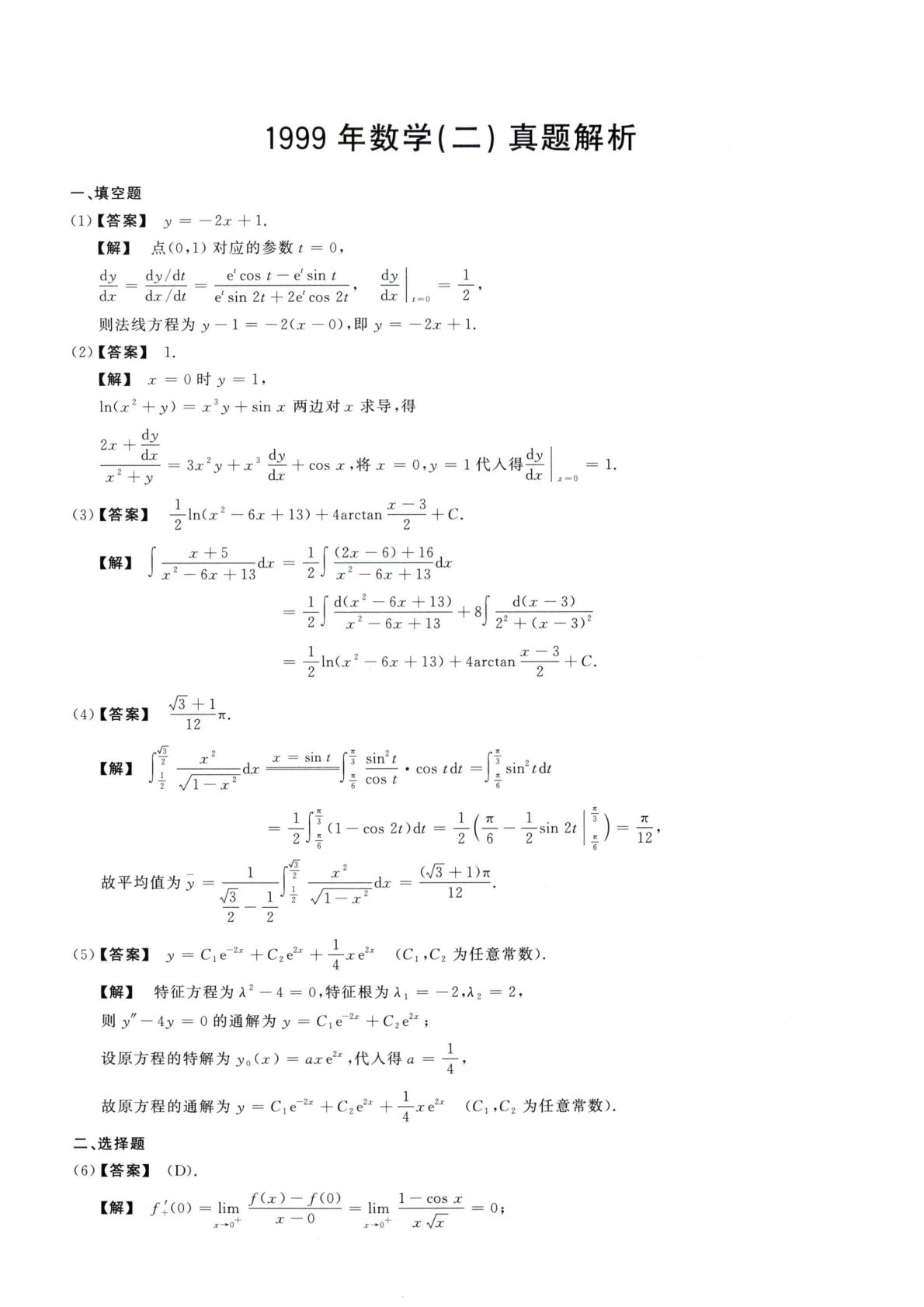 1999年数学(二)真题解析一、填空题(1)【答案】y=—2工+1.【解】点(0,1)对应的参数t=0,Axdy/dt_ecost—esintAx/ckesin2t+2ecos2tAx则法线方程为j/—1=—2(工一0),即夕=—2工+1・(2)【答案】1.【解】x=0时夕=1,ln(j;2+jy)=h3』+sinx两边对工求导:得2乂+字+yy+x3字+cos无,将工=0,夕=1代入得学I=1.G.XIx=01r—3(3)【答案】—ln(j:2—6z+13)+4arctan---------1-C.【解】(2工一6)+16x2—6工十13dxt=0丄I乂+5」_1『•r'一6z+13山_Tj...