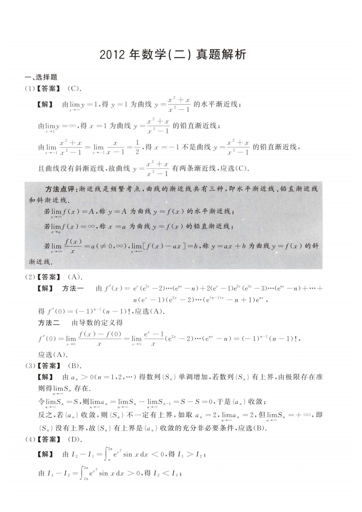 2012年数学(二)真题解析一、选择题(1)【答案】(C).【解】由limy=1,得》=1为曲线夕=务匚半的水平渐近线;ooX—12I由limy=°°9得乂=1为曲线丿=的铅直渐近线;工-*1x一12|12I由lim岂--—=lim―^―-=万,得z=—1不是曲线y=—----吕的铅直渐近线,1—1乞一1工一12x且曲线没有斜渐近线,故曲线y=务匸寸有两条渐近线,应选(C).x一1方法点评:渐近线是频繁考点,曲线的渐近线共有三种,即水平渐近线、铅直渐近线和斜渐近线.若lim/()—A,称;y=A为曲线y=f(.x)的水平渐近线;X-*°°若)=oo,称工=q为曲线》=/(%)的铅直渐近线;若l...