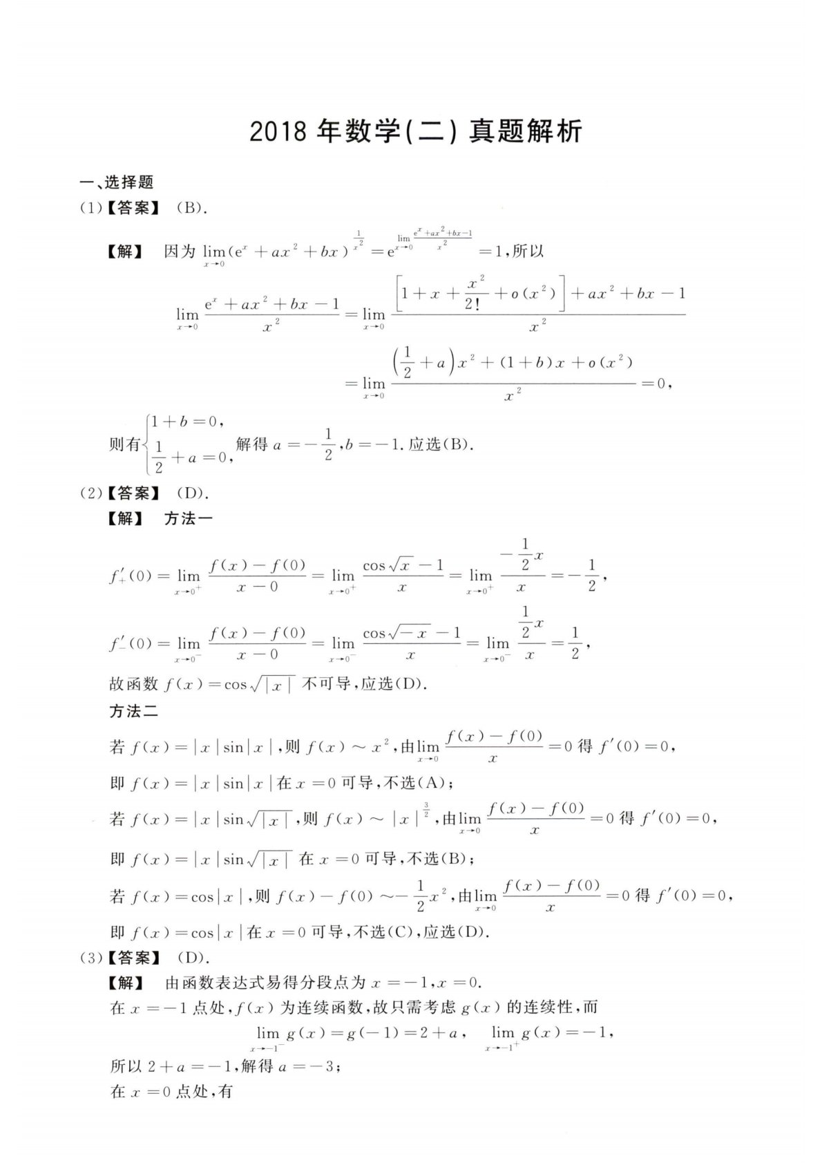 2018年数学(二)真题解析一、选择题(1)【答案】(B).【解】1..eX+ax-\-bx—1—2lim------------2---------因为lim(e^+ax2bx)x=e^-*0J=19所以■Z-*0eT+ax2+bx一1limx-*-0=lim■zf01+工+--o(a?2)+ax2+bx一1X22X2(*+匕)工2+(1+6)Jr+o(jr2)lim工―00,X2卩+6=0,则有]1质+a=0,(2)【答案】(D).【解】方法一解得a=,b=—l.应选(E).(0)=limHf()+心)"=Hm•Z—°z"COS\/~X—1.----------------=lim•o+1...