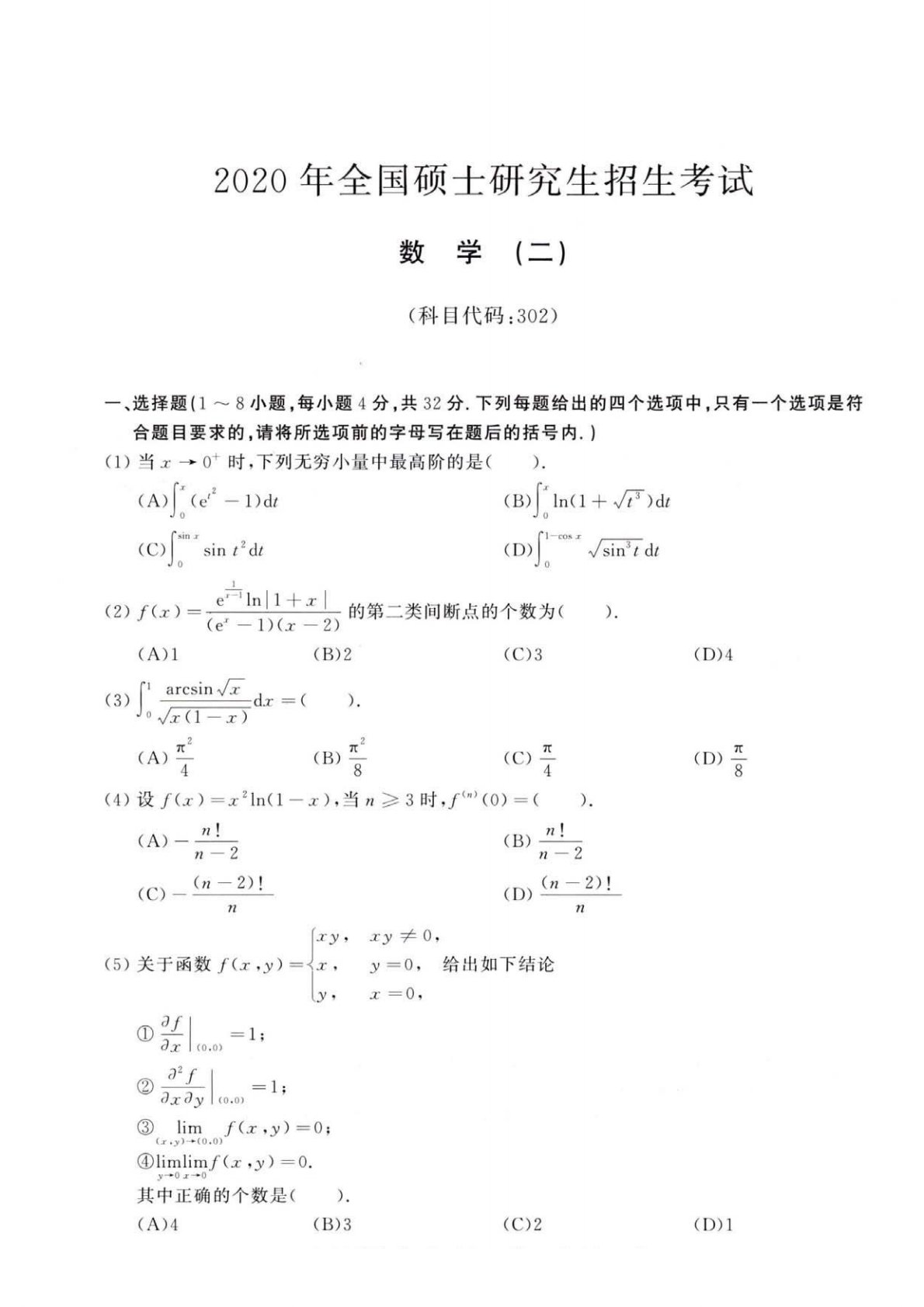 2020ÄêÈ«¹ú˶ʿÑо¿ÉúÕÐÉú¿¼ÊÔ(B)in(1+¡ÌF)daÆøÅÒ(A)̨֮·É(coj(D"¡Ìsinzdtln1+x(2)f(x)=µÄµÚ¶þÀà¼ä¶ÏµãµÄ¸öÊýΪ£¨£©.(e'-1)(x-2)(A)1(C)3(B)2(D)4ÁùÓ¾½Ú£¡£º(3)×Ó½ÐÈÏ(B)?ÒÒ£¿¼º¡±µ±(D):oÏõ£¨4£©Éèf£¨x£©=x2ln£¨1-x£©£¬µ±n¡Ý3ʱ£¬f"£¨0£©=£¨£©.¹ÐĺÅÐÄ(n-2)!(n2)!(D.(C)-nÍö¡°£¿¡°Äþ£º¡££¨5£©¹ØÓÚº¯Êýf£¨x£¬y£©=