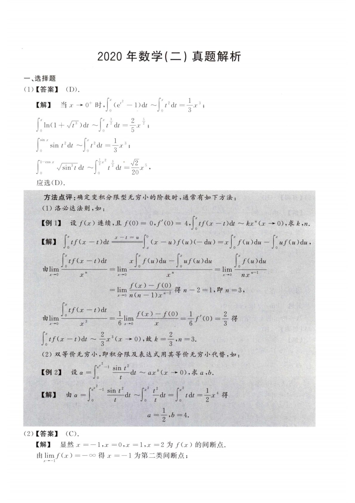 2020年数学(二)真题解析一、选择题⑴【答案】(D).【解】当工f。+时」(ez—1)dz〜]厂ck=£jr3;JoJo3[ln(1+)ck〜[t2dt=兀;JoJo5fsinjtCj-1sint2dt~厂d/=—x3;JoJo3应选(D).方法点评:确定变积分限型无穷小的阶数时,通常有如下方法:(1)洛必达法则,如:【例1】设yCr)连续,且/(0)=0,y'(0)=-Odr〜kxn(.x-J0jc—tu【解】tf(工—r)dr====(jt—u)/(zz)(—dw)=xf(u)du—JoJJCJo'0),求%ruf(u)du9由limx-*0tf{x—t)dfx-------------...