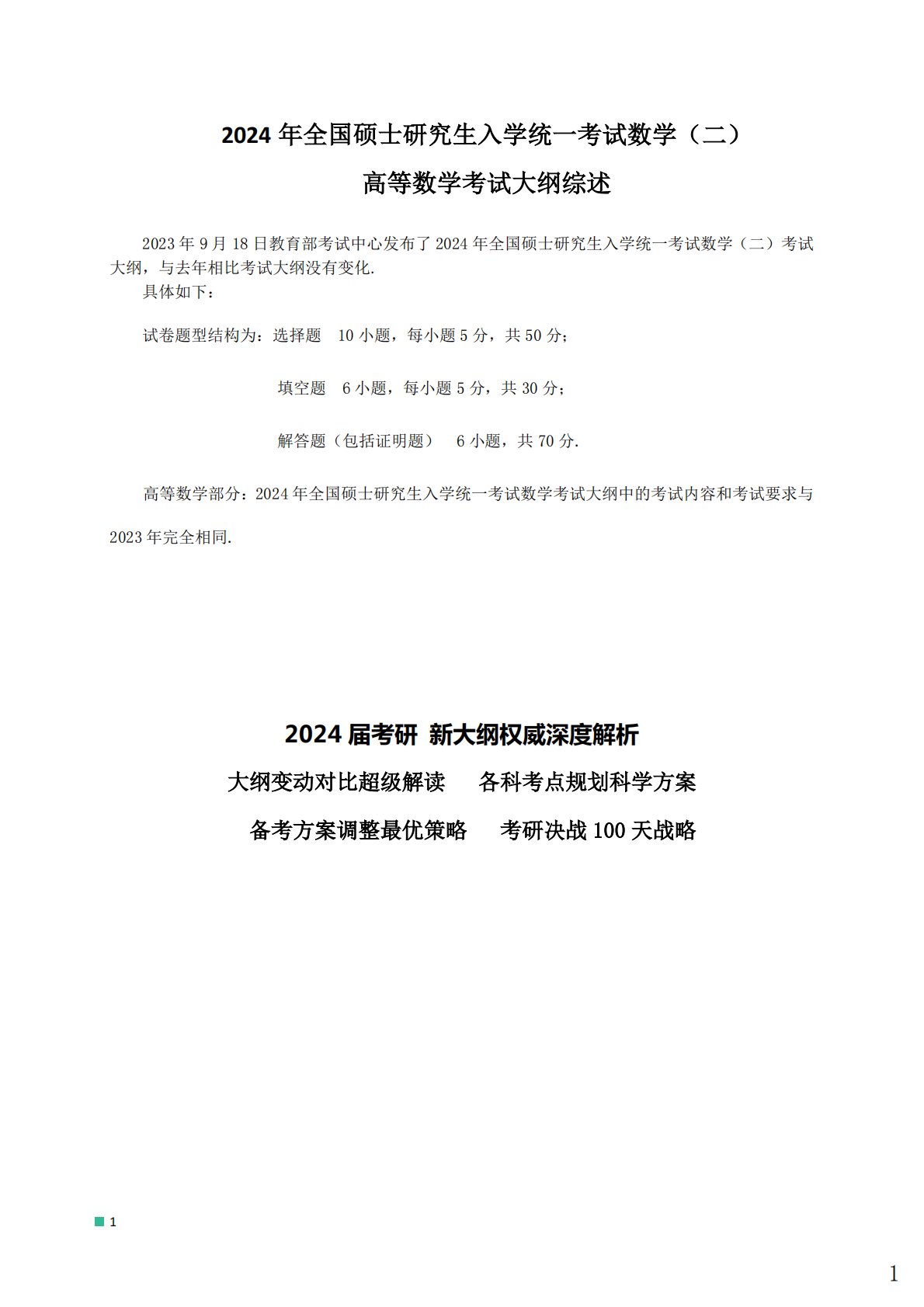 12024年全国硕士研究生入学统一考试数学(二)高等数学考试大纲综述2023年9月18日教育部考试中心发布了2024年全国硕士研究生入学统一考试数学(二)考试大纲,与去年相比考试大纲没有变化.具体如下:试卷题型结构为:选择题10小题,每小题5分,共50分;填空题6小题,每小题5分,共30分;解答题(包括证明题)6小题,共70分.高等数学部分:2024年全国硕士研究生入学统一考试数学考试大纲中的考试内容和考试要求与2023年完全相同.2024届考研新大纲权威深度解析大纲变动对比超级解读各科考点规划科学方案备考方案调整最优策略考研决战100天战略1百校文库—海量高校资料共享库百校文库是一个线上大学...