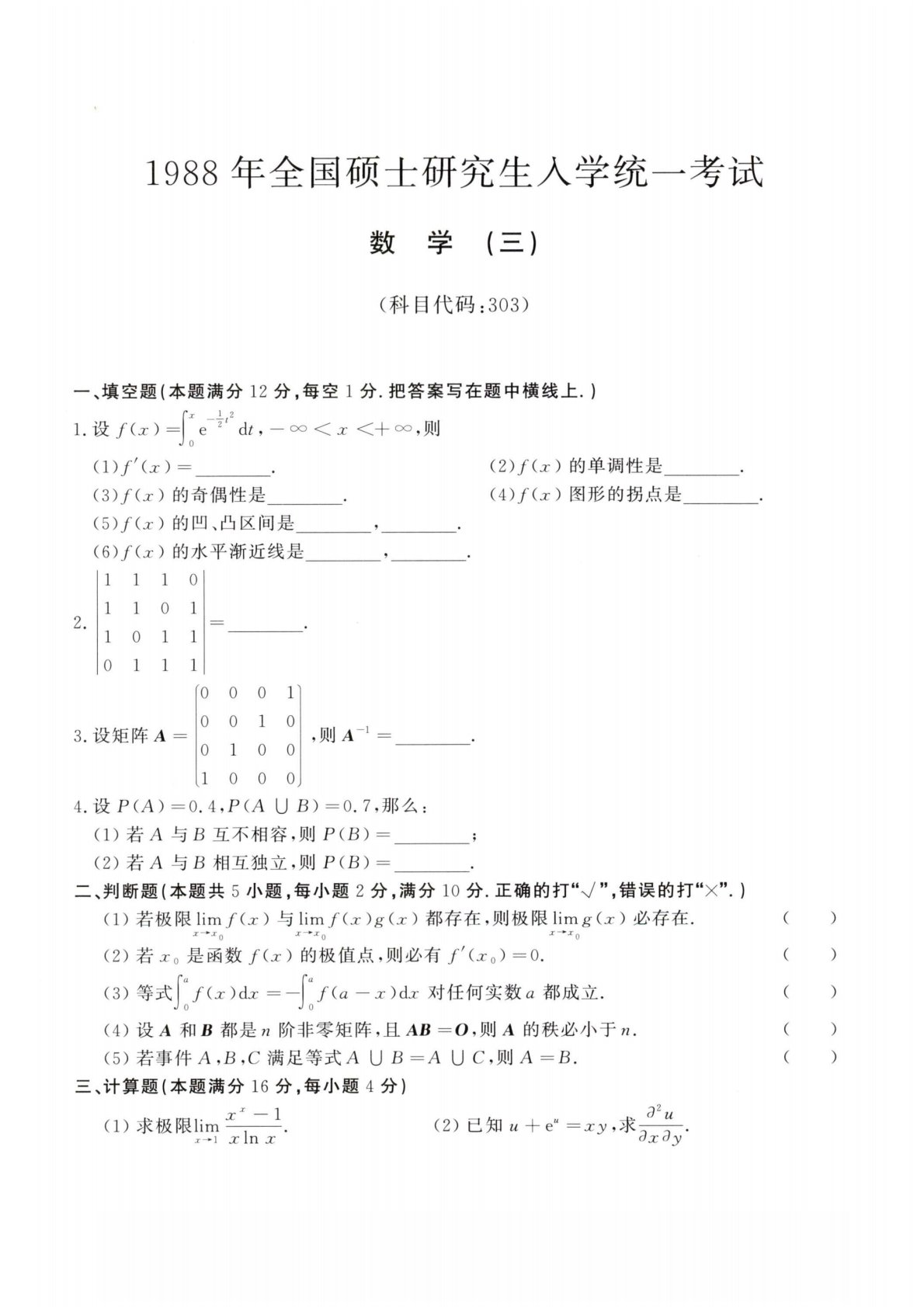 303数学三1988年考研初试真题