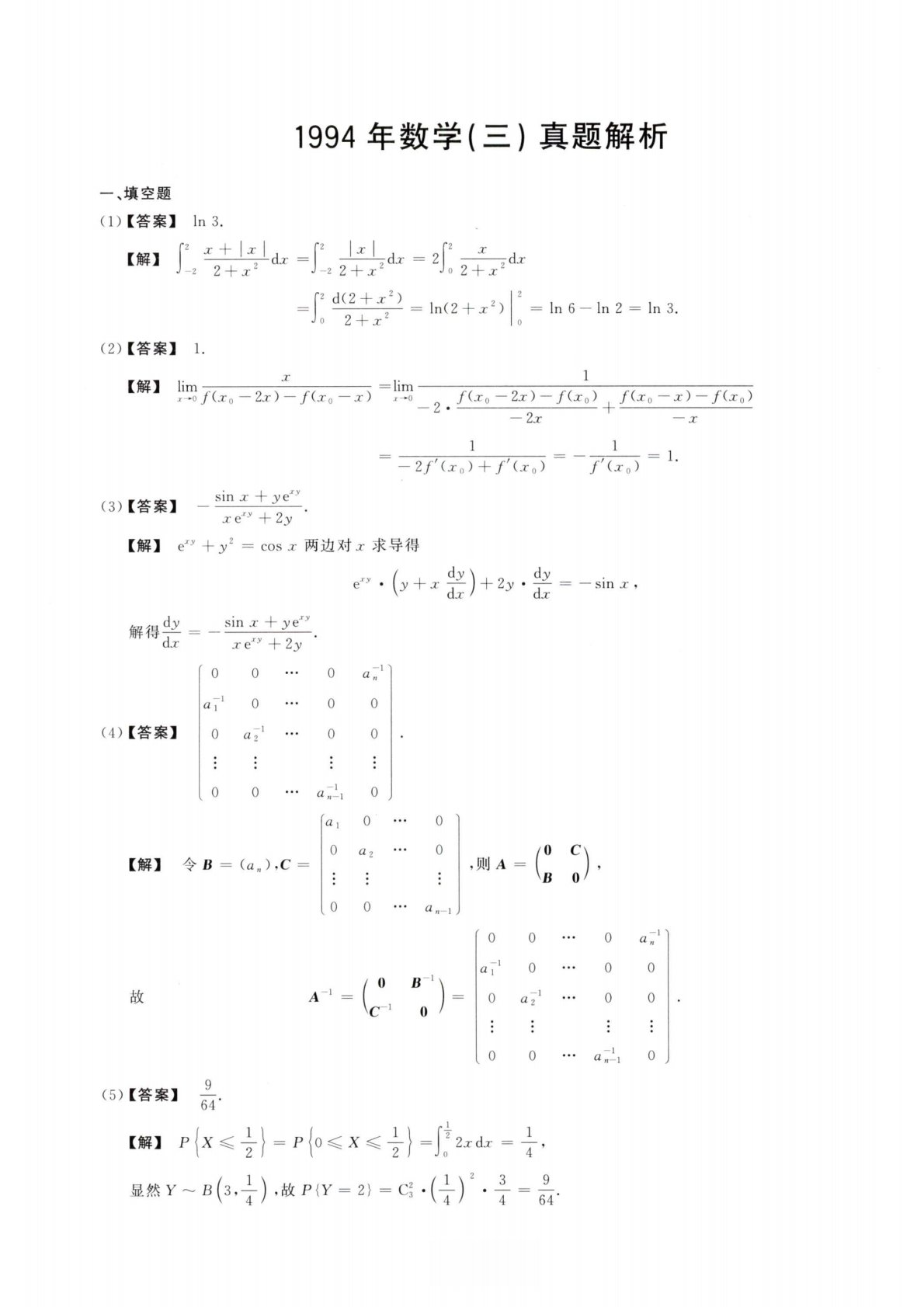 —、填空题1994年数学(三)真题解析(1)【答案】In3.'2工+|工|」dr=-22+x2【解】2x--------djr02+J722=In6—In2=In3・o——(2)【答案】1.X【解]辄兀m?云二75巳吧丁一2•—2x—x(3)【答案】sinx1—2厂(工。)+十(工。)]/■'(•To)1.xexy+2y【解】exy+y2=cosx两边对x求导得cosXy++2/—sinx9解得字sinjc+yey000—1(4)【答案】-150000-10000_15—10Qi00【解】令〃=a),c0如0,则A0CB000000-1、QnB10-15000故A"11____________...