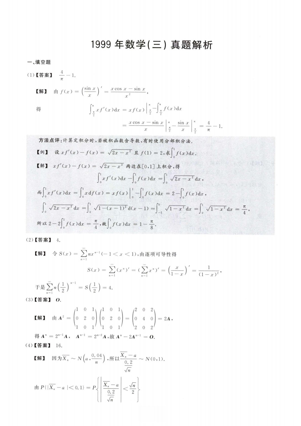 1999年数学(三)真题解析一、填空题(1)【答案】—-1.【解】由/(z)xcosx—sinjcx2得J”工十(工)dr=jcf{x)I守—_zcos工一sin工卜sin工I"_4方法点评:计算定积分时,若被积函数含导数,有时使用分部积分法.【例】设—/(攵)=%/2rr—x2且/(I)=2,求[/(无)dr・【解】jcf\jc)—/(□;)=(2工一芒两边在[0,1]上积分,得[—[/(jT)drc=|—x2dx,JoJoJ0而£x/z(j?)dx=[严甘(工)=jcf(x)L—J/Q)dz=2—『y(z)dz,[J2工一x1dx=[/—Q—I)'d(_r—1)=[s/1—t2dx=「%/...