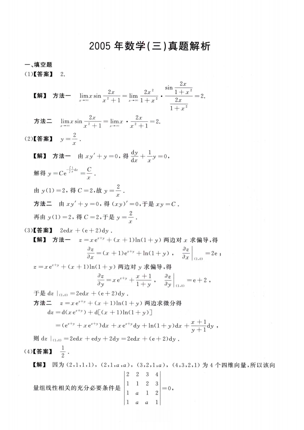 2005年数学(三)真题解析一、填空题(1)【答案】2.【解】方法一limgsin--------=lim---------工-*°°jc+1工〜°°1+工1+工22工-2工方法二limjcsin--------=limj:•—-------=2.LXjc+1工-*^工+1【解】方法一由xy'+3/=0,得字+丄夕=0,QXJC解得X2由夕(1)=2,得C=2,故夕=—.x方法二由jcy'+3/=0,得(工夕)'=0,于是xy=C.2再由夕(1)=2,得C=2,于是y——.x(3)【答案】2edrc+(e+2)dj/.【解】方法一z—jcel+y+(x+l)In(l+y)两边对鼻求偏导,得=(...