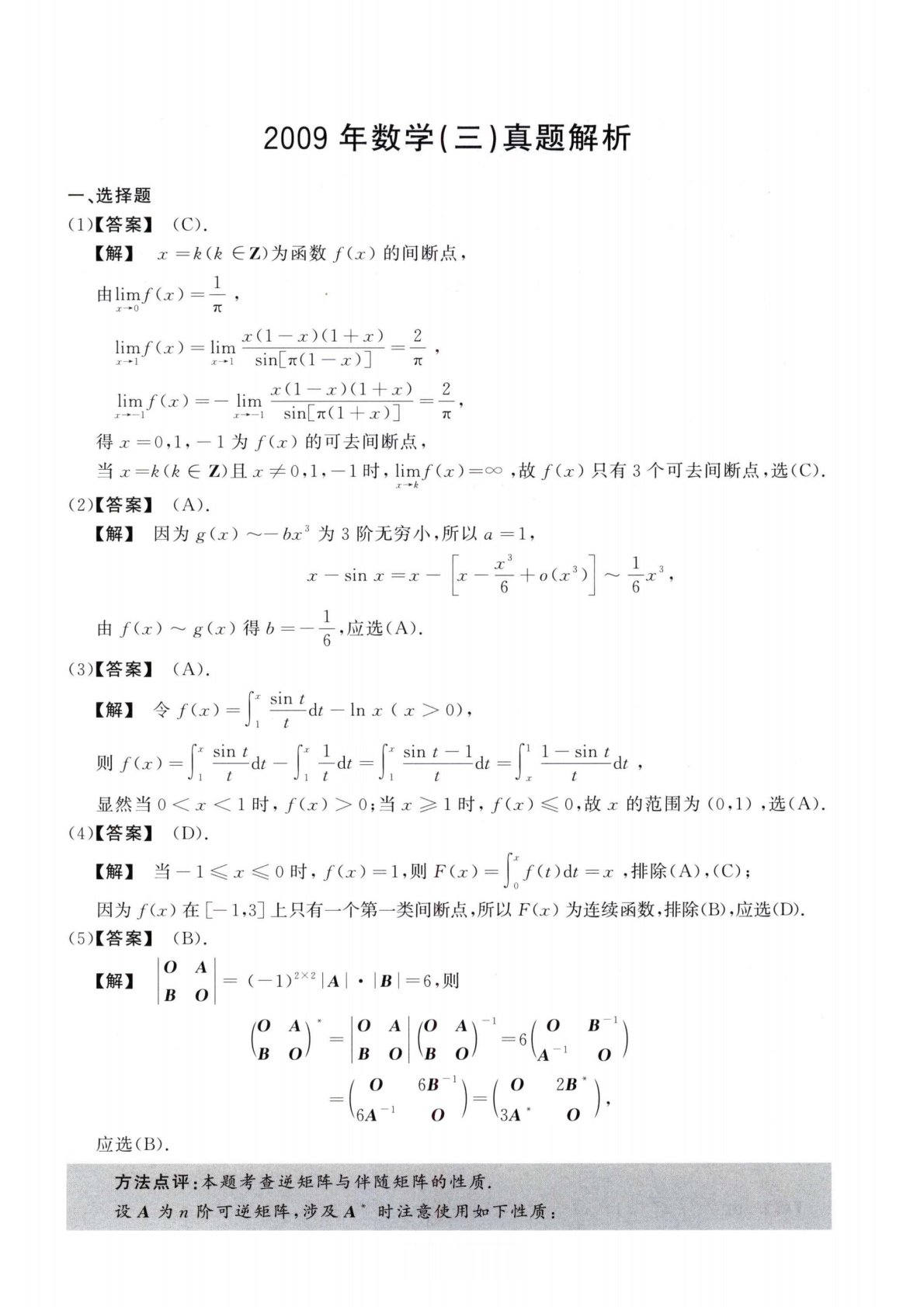 2009年数学(三)真题解析一、选择题(1)【答案】(C).【解】z=k(kGZ)为函数fdx)的间断点,由lim/(j7)=—,x-*O7TX->1X(1—Jt)(l+j?)sin[7t(l一工)]2_7Clim/(jc)=—lim•Zf—1X—*■—1j?(1一)(1+J:)sin[7r(1+h)]£7T得工=0,1,—1为/(乂)的可去间断点9当x=k(kGZ)且鼻工0,1,一1时,lim/(j:)=°°,故/(工)只有3个可去间断点9选(C).工fk(2)【答案】(A).【解】因为gS)〜一处"为3阶无穷小,所以a=1,x一smX=x-3x一—o(工3)6由/(工)〜g(z)得〃=—,...