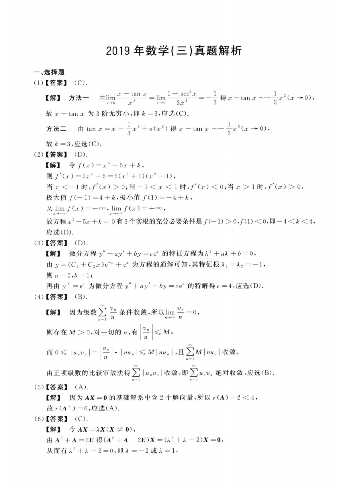 2019年数学(三)真题解析一、选择题(1)【答案】(C).【解】方法一由lim三二竽三=lim上二萼£=—寺得Z—tan工〜一£川(工—0),—0x…3工'33故工一tanx为3阶无穷小,即k=3,应选(C).方法二由tanx=x+3+o(j:3)得z-tanxx3(j:0),故怡=3,应选(C).(2)【答案】(D).【解】令/(j:)=J?5—+b,则f'(J7)=4一5=5(x2+1)(J72一1),当工0,极大值/■(一1)=4+茶极小值/(I)=—4+&,又limfO=一00,lim/()=+00,―►—OO工一►—j—OO故方程工5—5工+怡=0有3个实根的充分必要条件是/(-1...