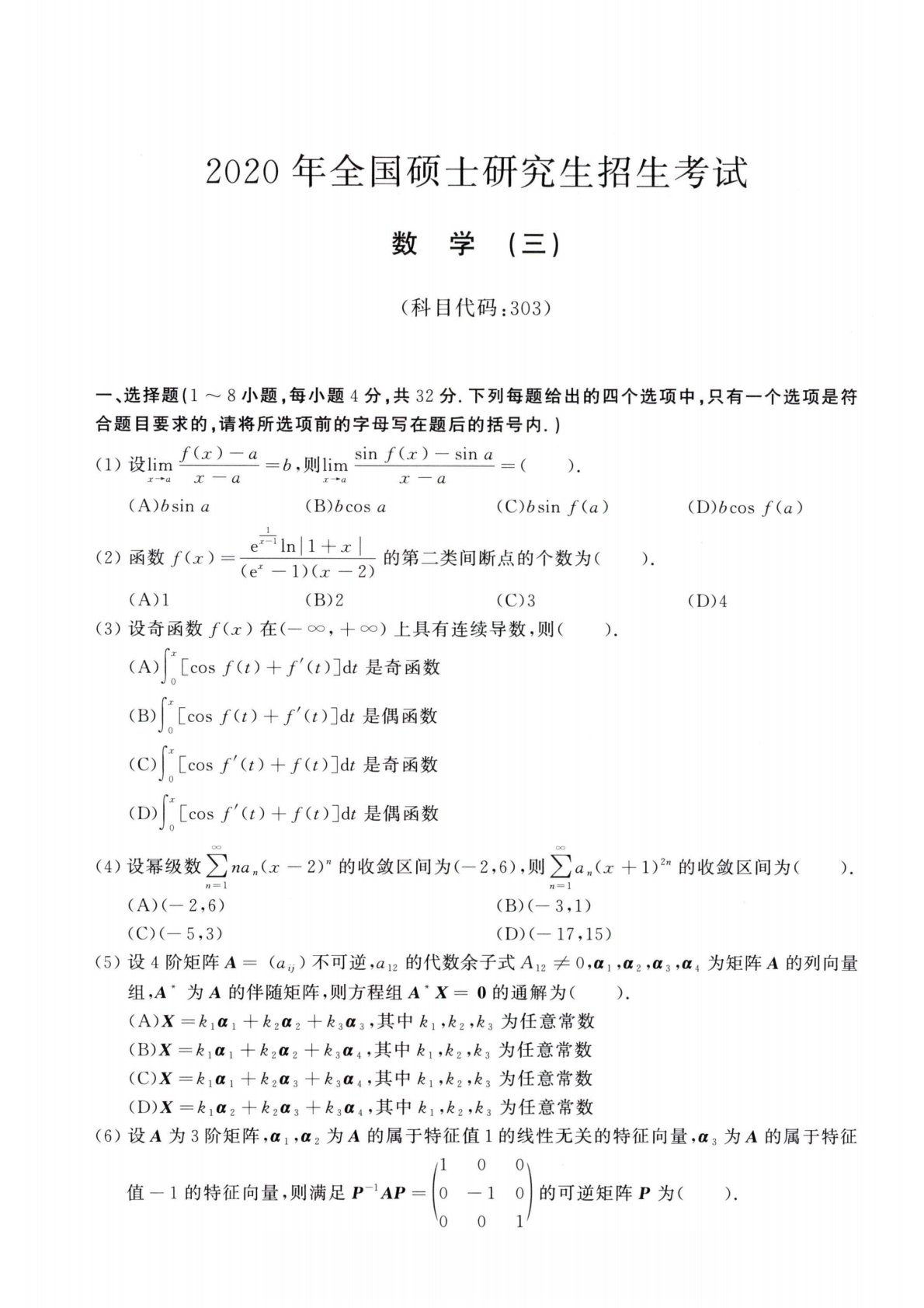 2020年全国硕士研究生招生考试数学(三)(科目代码:303)一、选择题(1〜8小题,每小题4分,共32分.下列每题给出的四个选项中,只有一个选项是符合题目要求的,请将所选项前的字母写在题后的括号内.)(1)设1口心—°=b,则limsinfQ)—sina=().x-^ax——ax-*a3C——a(A)6sina(B)6cosa(C)6sin/(a)iInI14-rrI(2)函数心)=二的第二类间断点的个数为((e—1)(j?—2)(A)l(B)2(03(3)设奇函数心)在(-00,-1-00)上具有连续导数,则().(A)f[cos/"(/)+/^(Olldr是奇函数J0(E)「[cos/(...