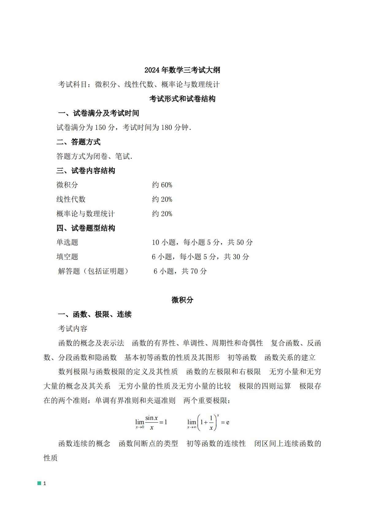 12024年数学三考试大纲考试科目:微积分、线性代数、概率论与数理统计考试形式和试卷结构一、试卷满分及考试时间试卷满分为150分,考试时间为180分钟.二、答题方式答题方式为闭卷、笔试.三、试卷内容结构微积分约60%线性代数约20%概率论与数理统计约20%四、试卷题型结构单选题10小题,每小题5分,共50分填空题6小题,每小题5分,共30分解答题(包括证明题)6小题,共70分微积分一、函数、极限、连续考试内容函数的概念及表示法函数的有界性、单调性、周期性和奇偶性复合函数、反函数、分段函数和隐函数基本初等函数的性质及其图形初等函数函数关系的建立数列极限与函数极限的定义及其性质函数的左极限和右极限...