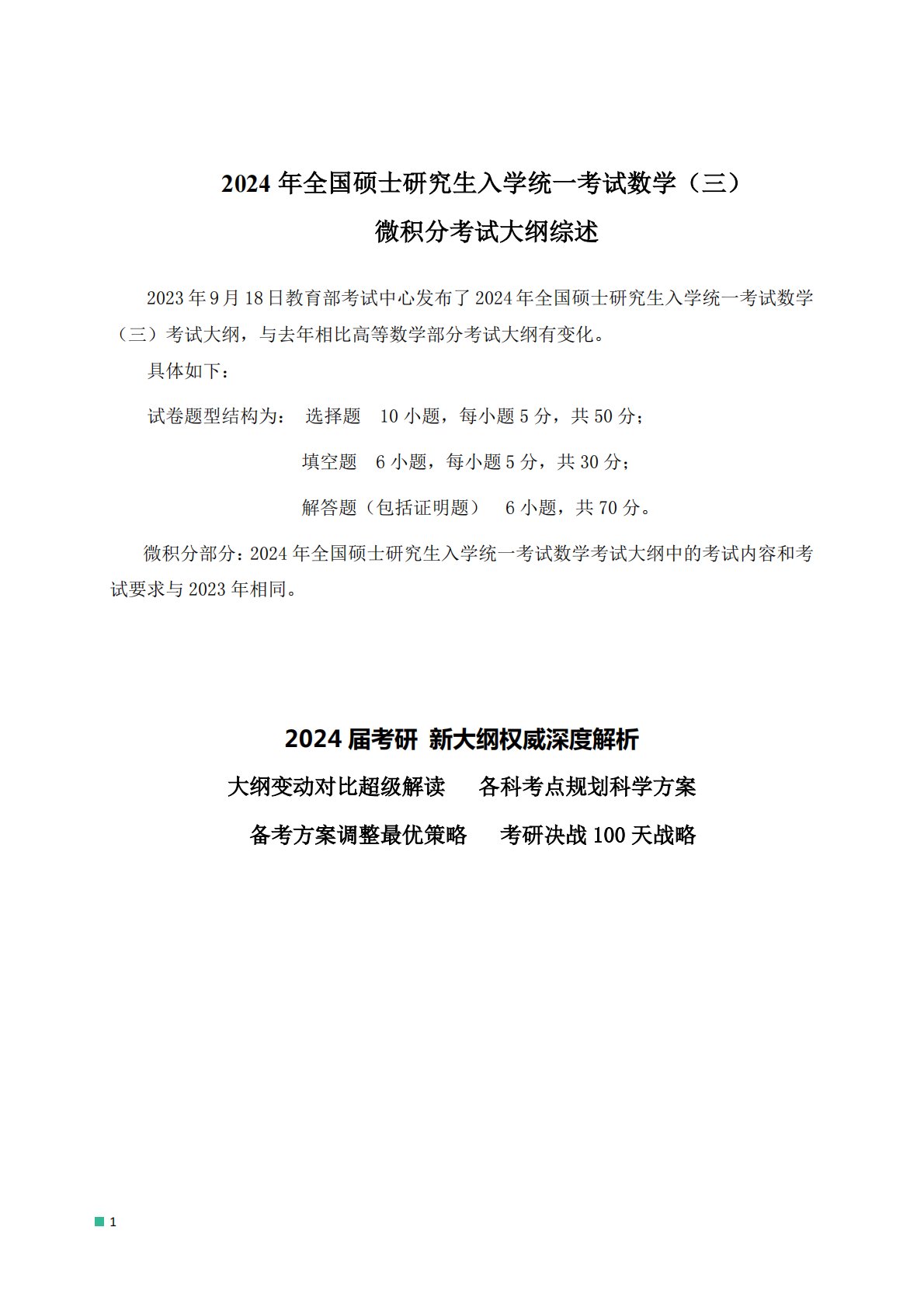 12024年全国硕士研究生入学统一考试数学(三)微积分考试大纲综述2023年9月18日教育部考试中心发布了2024年全国硕士研究生入学统一考试数学(三)考试大纲,与去年相比高等数学部分考试大纲有变化。具体如下:试卷题型结构为:选择题10小题,每小题5分,共50分;填空题6小题,每小题5分,共30分;解答题(包括证明题)6小题,共70分。微积分部分:2024年全国硕士研究生入学统一考试数学考试大纲中的考试内容和考试要求与2023年相同。2024届考研新大纲权威深度解析大纲变动对比超级解读各科考点规划科学方案备考方案调整最优策略考研决战100天战略百校文库—海量高校资料共享库百校文库是一个线上大学...