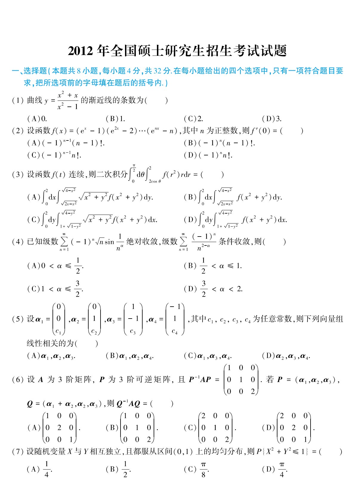 303数学三2012年考研初试真题