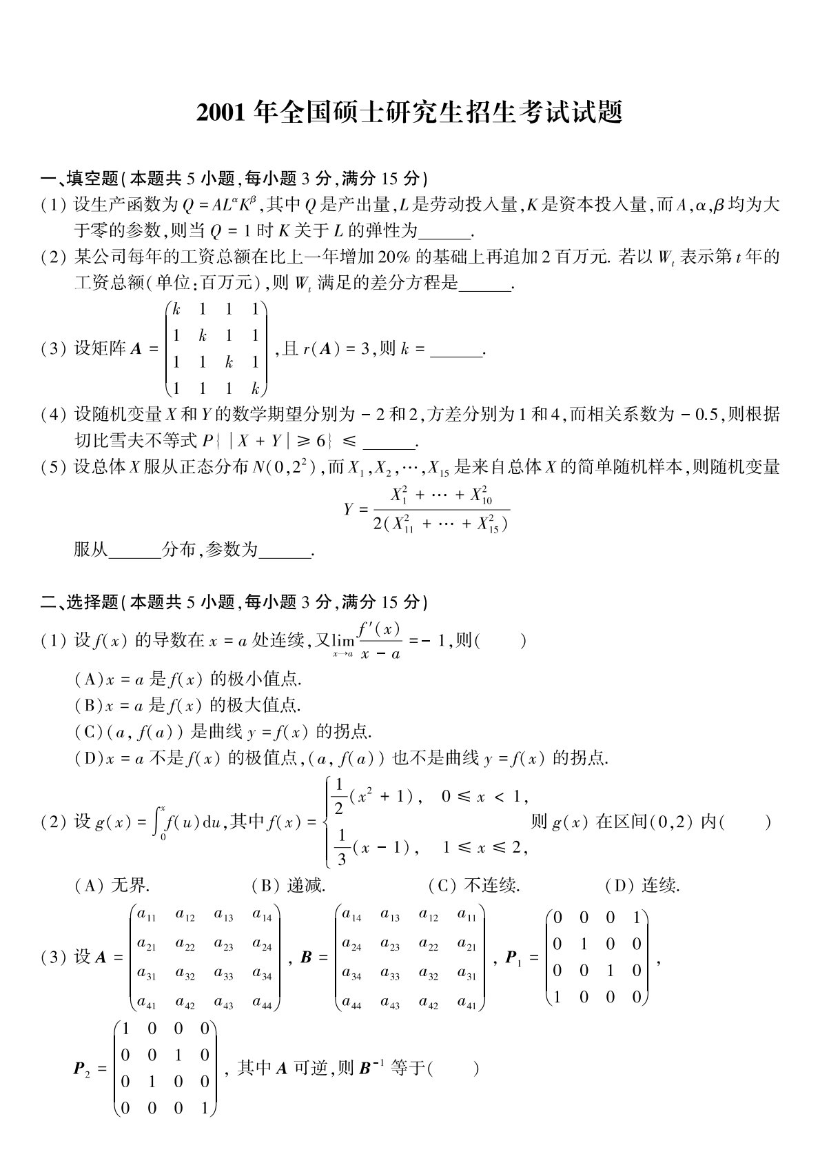 303数学三2001年考研初试真题